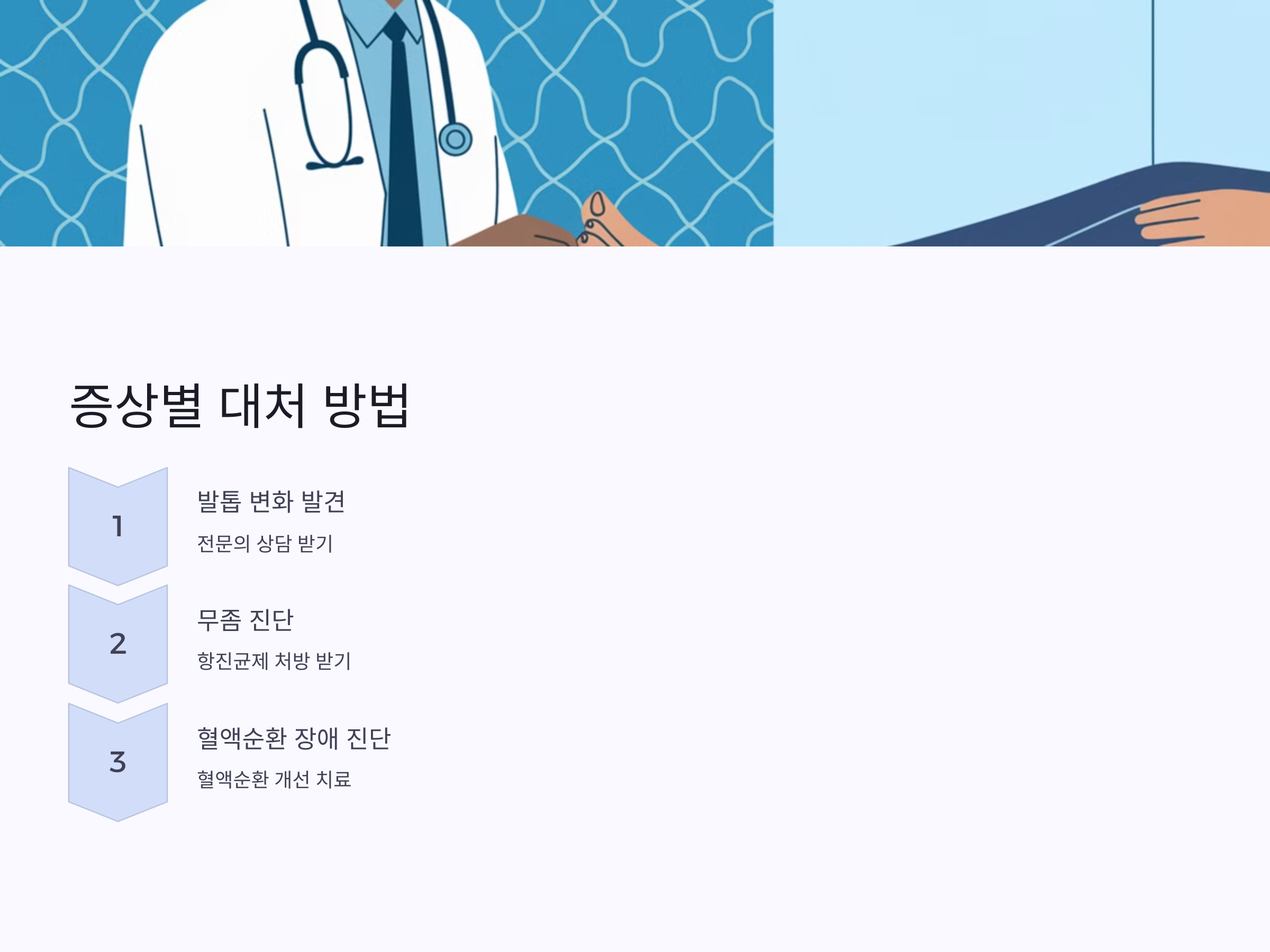 발톱에 이상이 생기면 먼저 전문의의 상담을 받는 것이 중요합니다. 무좀일 경우 항진균제 처방을 받을 수 있으며, 혈액순환 장애의 경우 혈액순환을 개선하는 치료가 필요합니다.