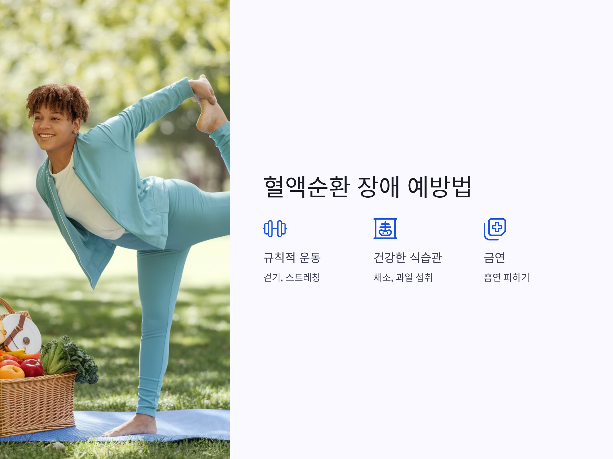 혈액순환 장애를 예방하려면 규칙적인 운동과 건강한 식습관이 중요합니다. 스트레칭이나 걷기와 같은 간단한 운동을 꾸준히 해주면 혈액순환이 개선됩니다. 또한, 나트륨 섭취를 줄이고, 채소와 과일을 많이 섭취하는 것이 좋습니다. 흡연과 과음은 혈액순환에 악영향을 미치므로 이를 피하는 것이 필요합니다.