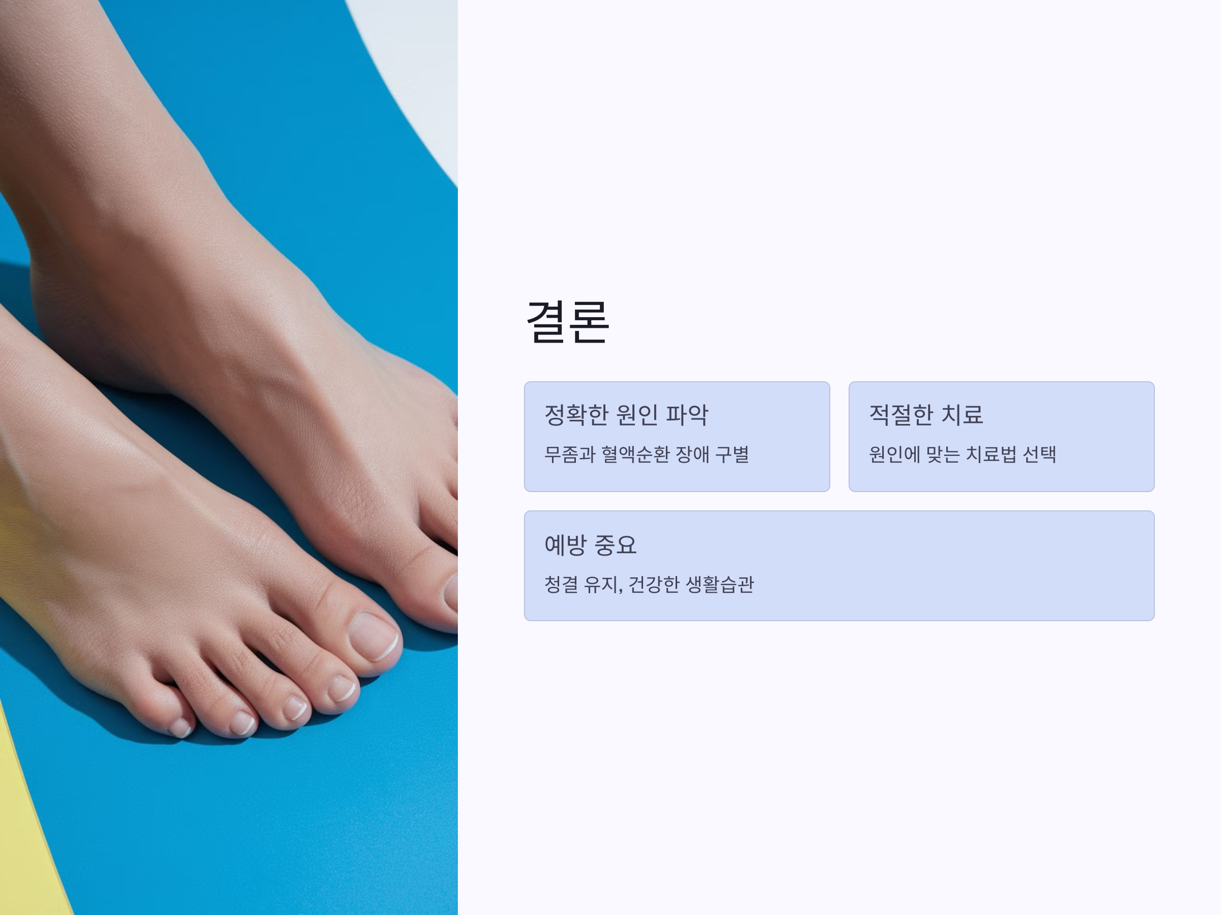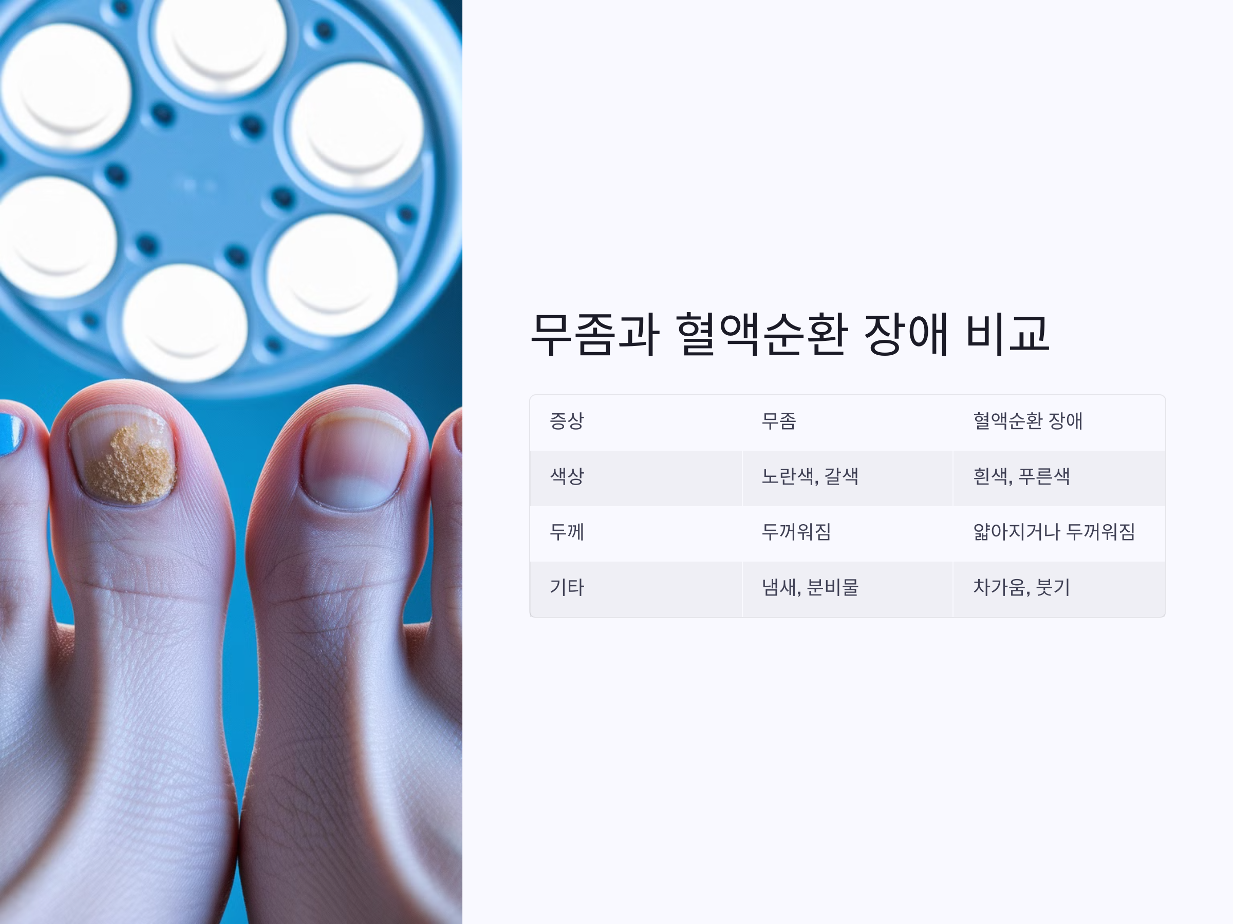 무좀과 혈액순환 장애는 발톱에 나타나는 변화가 비슷하지만, 원인과 증상은 다릅니다. 무좀은 진균 감염으로 인한 발톱의 변화이며, 혈액순환 장애는 혈액 공급 부족으로 인해 발톱에 변화가 생깁니다. 각각의 원인에 맞는 치료가 필요하며, 발톱의 이상이 지속된다면 전문의의 상담을 받는 것이 좋습니다.