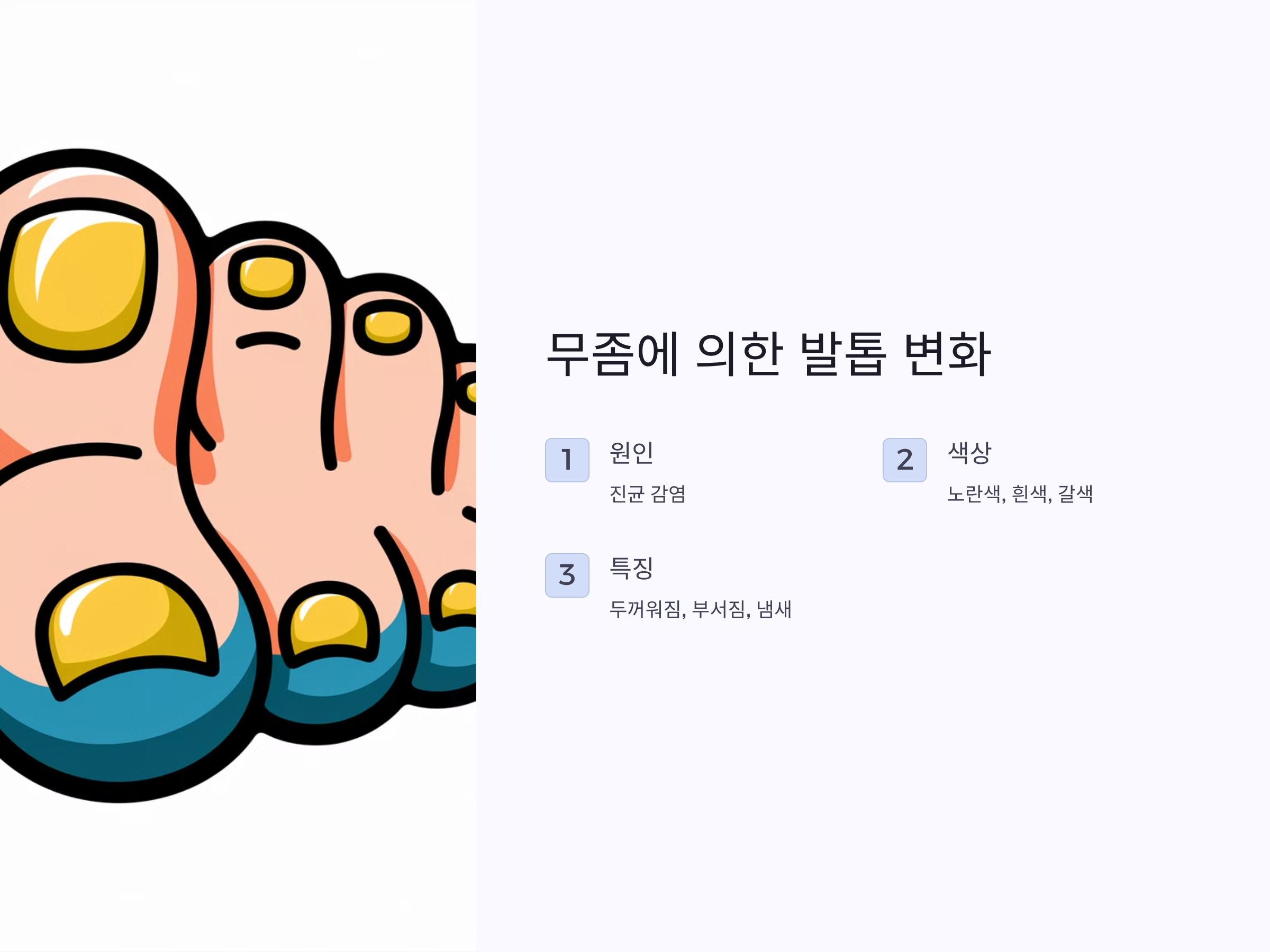무좀은 진균감염에 의해 발생하는 질환으로, 발톱이 두꺼워지고 변색되는 대표적인 원인 중 하나입니다. 무좀의 경우, 발톱이 감염되어 발톱이 누렇게 변하고, 시간이 지나면 점차 두꺼워지며 부서지기도 합니다.