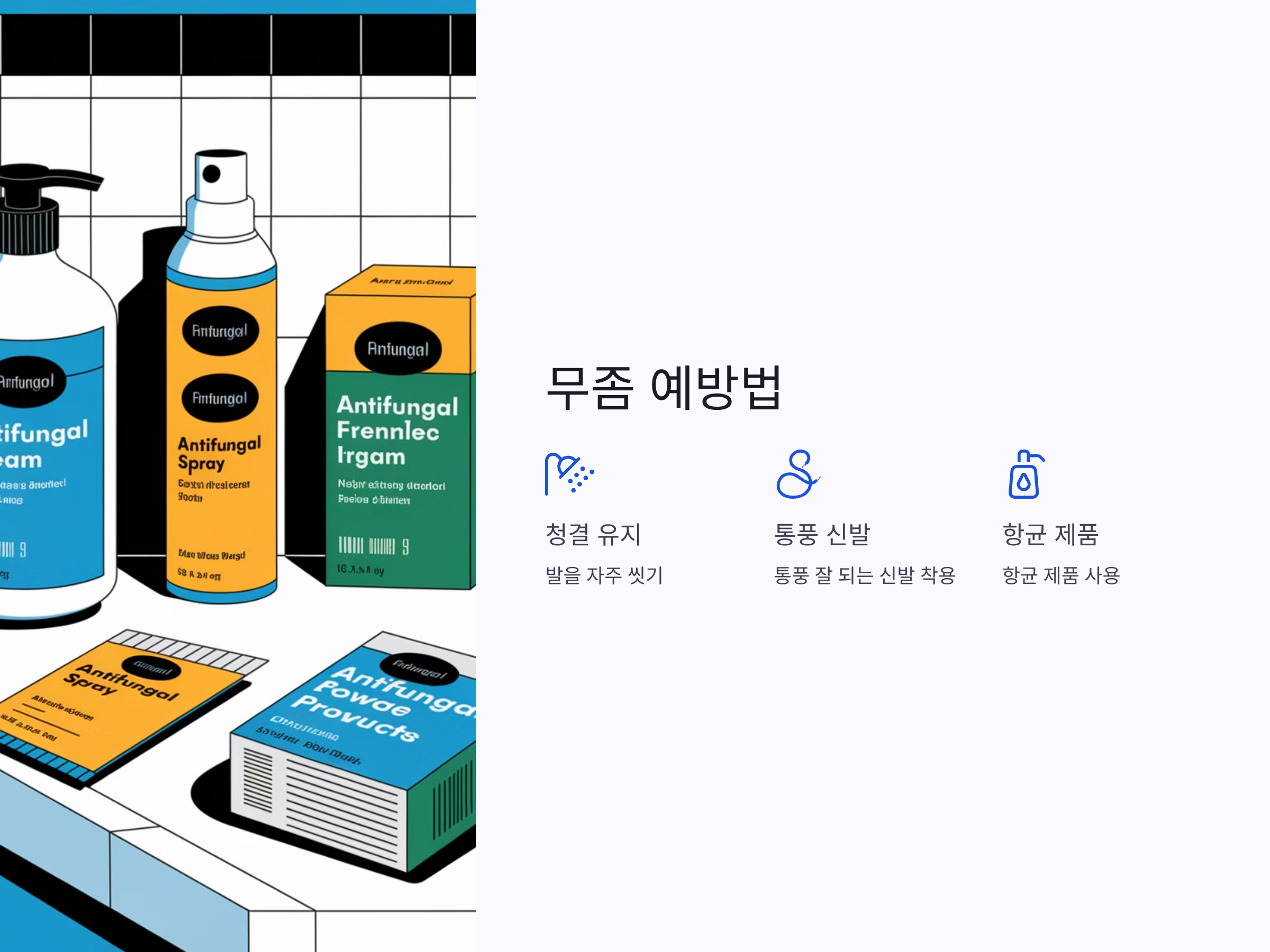 무좀은 감염성 질환이므로, 발을 청결하게 유지하고 습기 많은 환경을 피하는 것이 중요합니다. 발을 자주 씻고, 통풍이 잘 되는 신발을 착용하며, 발에 땀이 많이 나는 경우에는 항균 제품을 사용하는 것이 좋습니다. 또한, 발톱을 자주 관리하고 다리나 발에 상처가 나지 않도록 주의해야 합니다.
