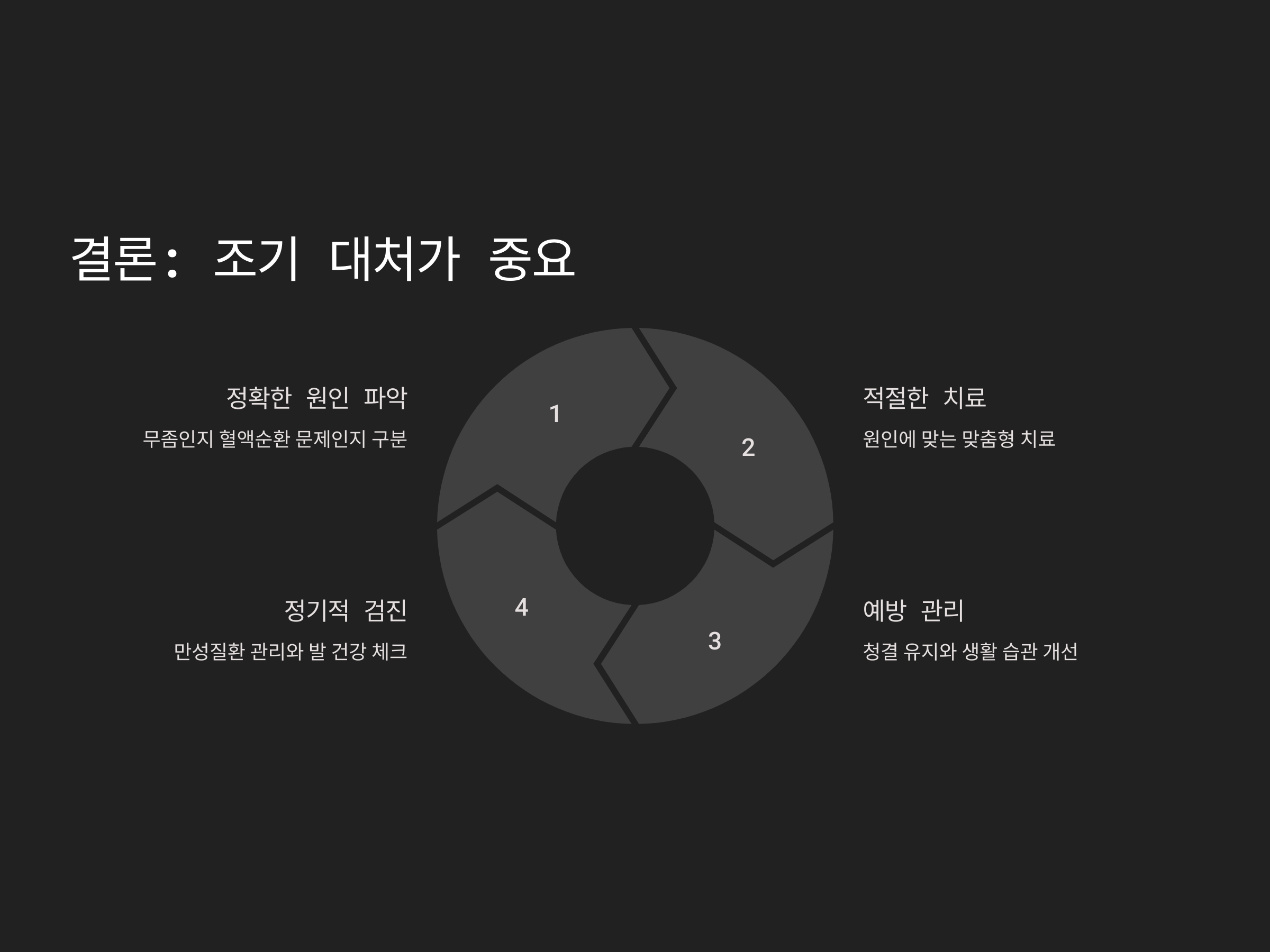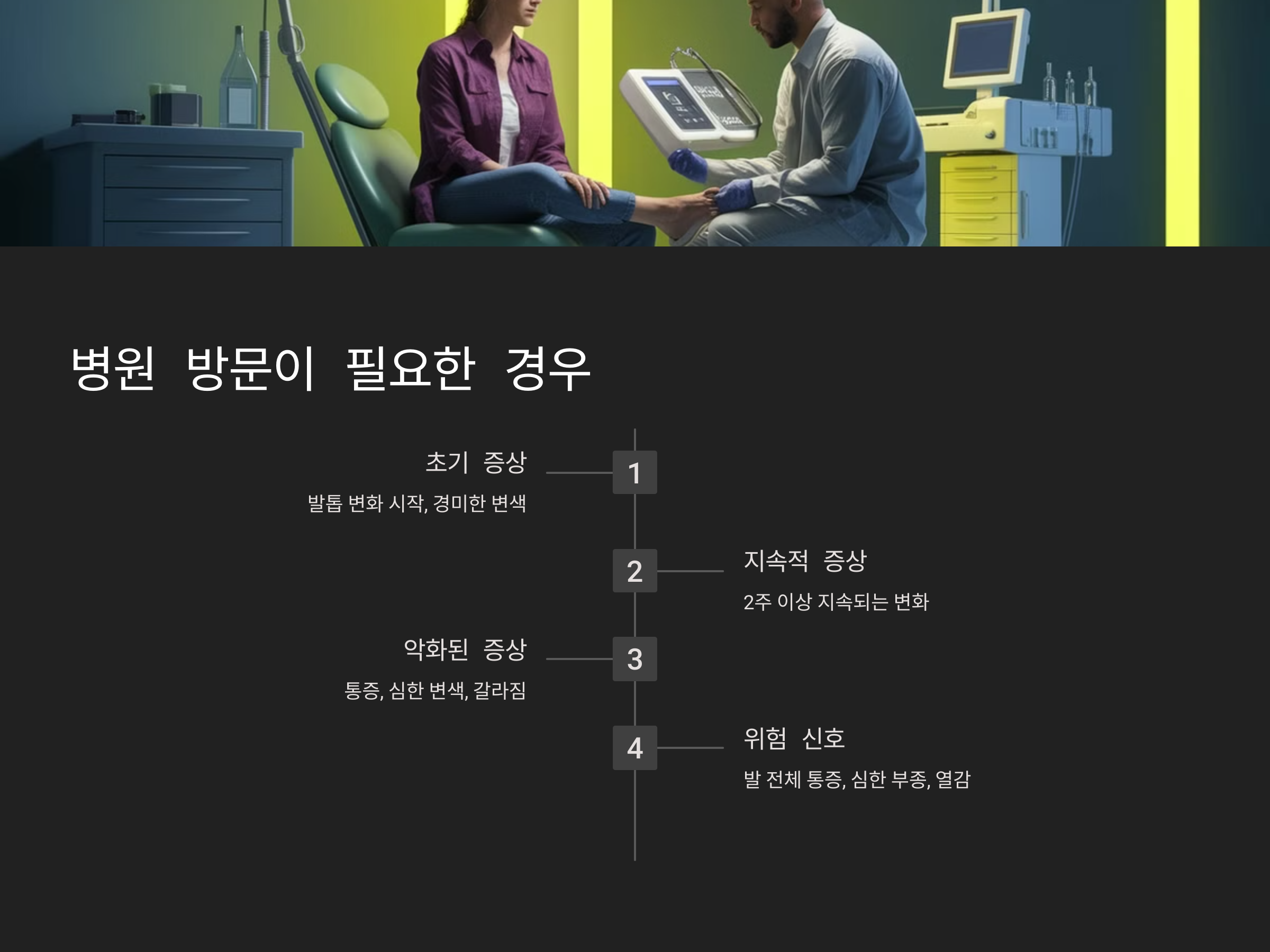 발톱에 변화가 생기면 자연스럽게 병원에 가야 할 시점을 고민하게 됩니다. 무좀은 보통 항진균제 치료를 통해 회복이 가능하지만, 혈액순환 문제는 만약 방치할 경우 심각한 합병증을 유발할 수 있습니다. 따라서, 발톱의 변화가 지속되거나 심각한 통증을 동반한다면 병원을 방문해 정확한 진단을 받는 것이 좋습니다.