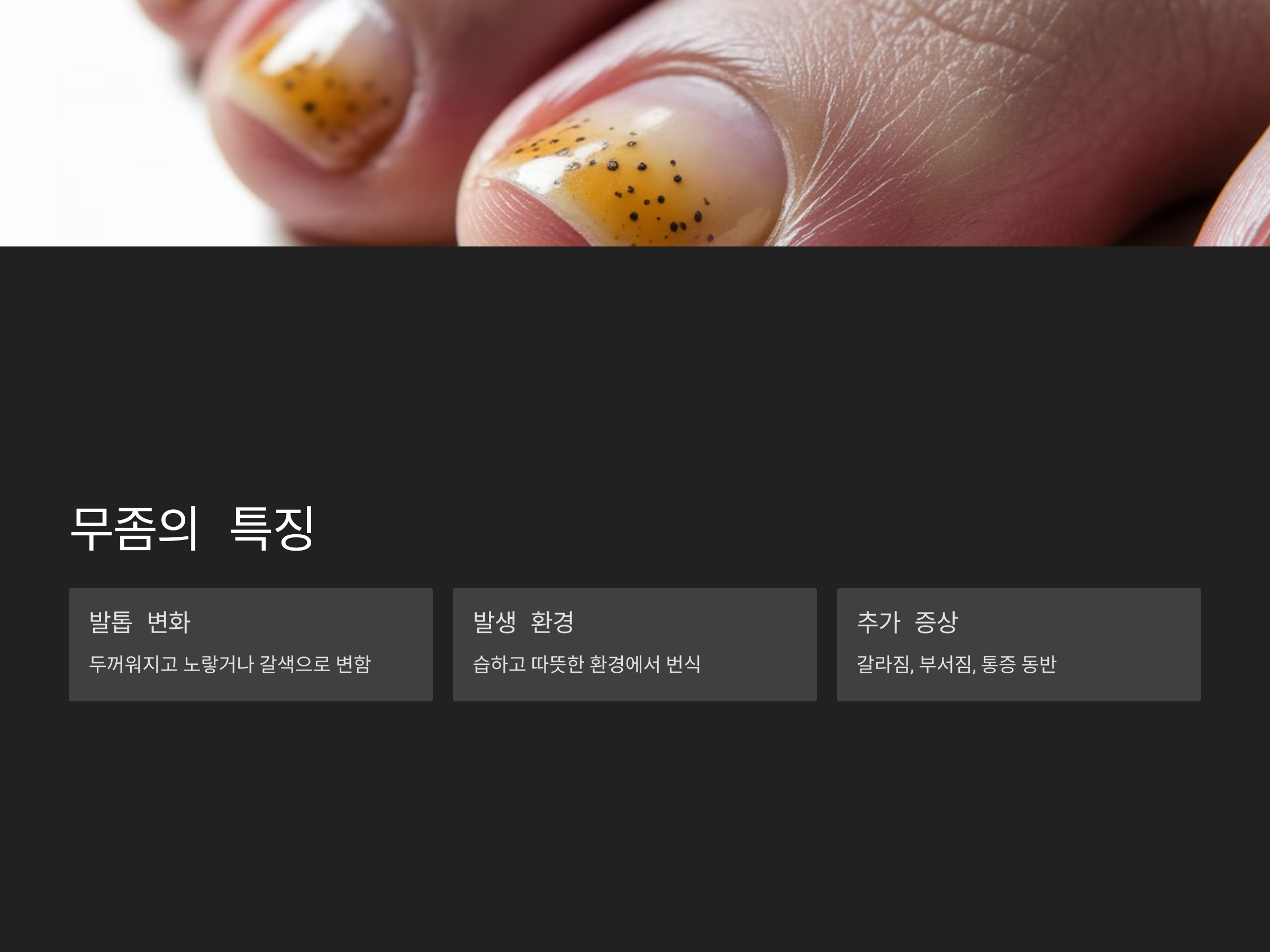 무좀은 피부에 곰팡이가 감염되어 발생하는 피부 질환입니다. 이 균은 특히 습하고 따뜻한 환경에서 잘 번식하며, 발톱에도 영향을 미칠 수 있습니다. 무좀으로 인한 발톱의 변화는 일반적으로 발톱이 두꺼워지고, 색이 노랗거나 갈색으로 변하는 것이 특징입니다. 또한, 발톱에 갈라짐이나 부서짐이 나타날 수 있으며, 이로 인해 발톱이 매우 민감해지고, 통증을 동반하기도 합니다.