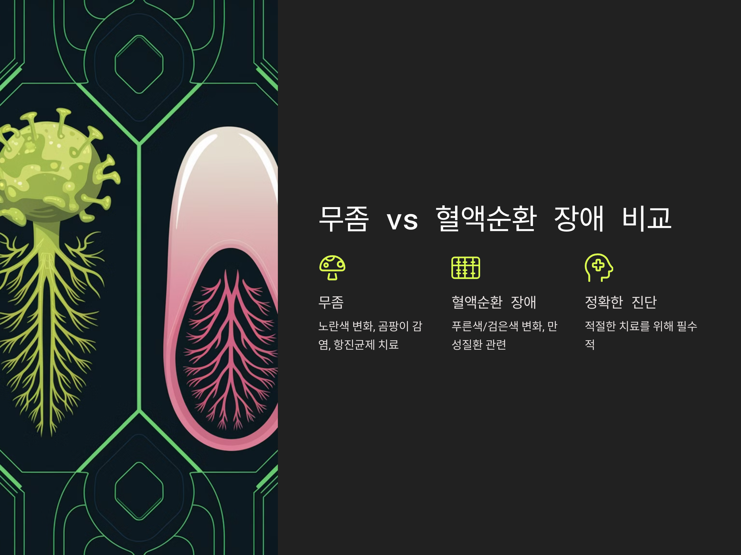 무좀과 혈액순환 장애는 발톱에 비슷한 변화를 일으킬 수 있지만, 이 두 가지 문제는 원인과 치료 방법이 전혀 다릅니다. 무좀은 곰팡이 감염으로 발생하는 질환으로, 발톱이 두꺼워지고 노란색으로 변하는 특징을 보입니다. 반면, 혈액순환 장애는 혈액이 발톱까지 제대로 공급되지 않아 발톱 색이 변하거나 성장에 영향을 미칩니다.
