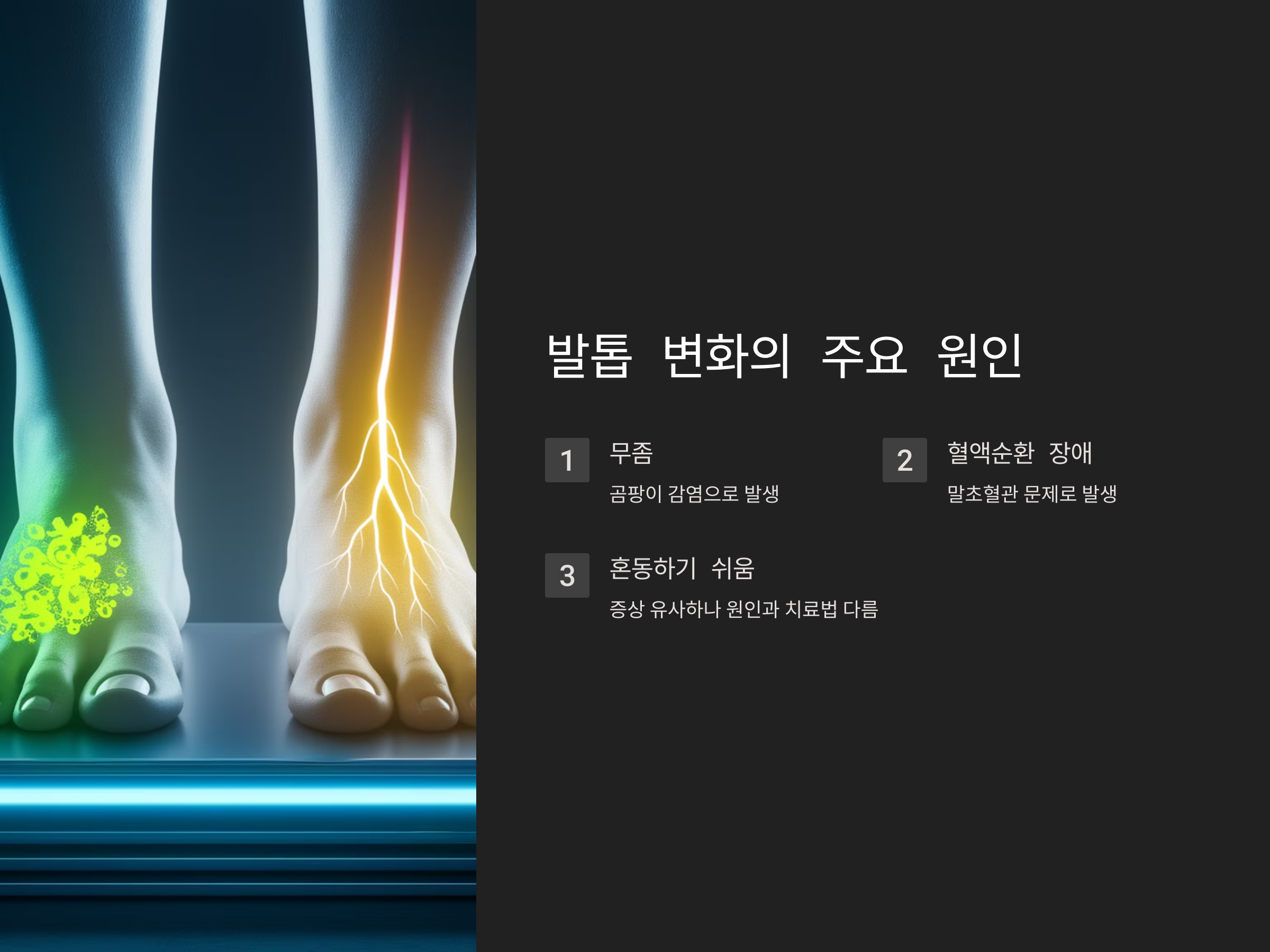 발톱 변화의 비교: 무좀과 혈액순환 장애