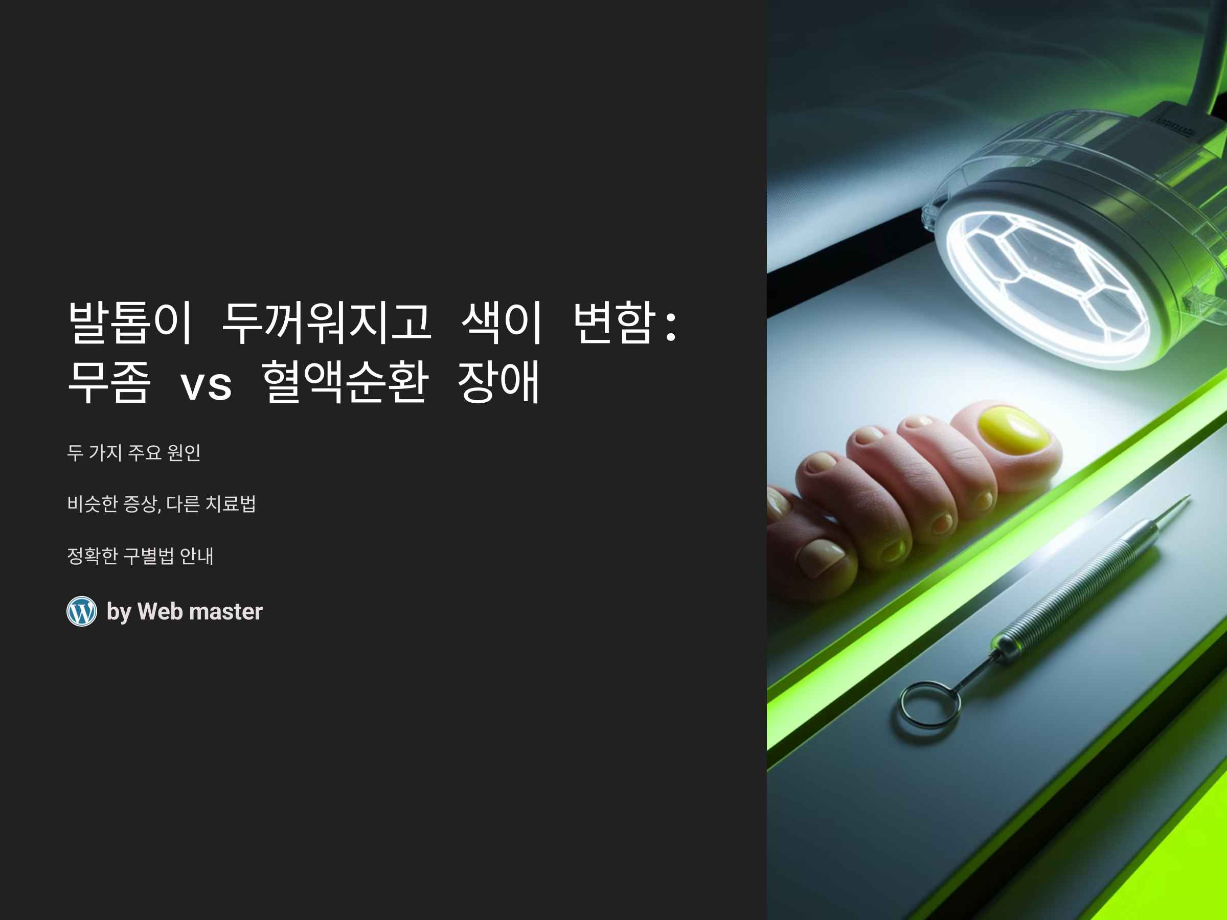 발톱이 두꺼워지거나 색이 변하는 현상은 다양한 원인에 의해 발생할 수 있습니다. 그 중 가장 흔하게 떠오르는 원인은 바로 '무좀'과 '혈액순환 장애'입니다. 이 두 가지는 증상에서 비슷한 점이 있지만, 그 원인과 치료 방법은 완전히 다릅니다. 오늘은 발톱의 두꺼워짐과 색 변화가 무좀 때문인지, 아니면 혈액순환 장애 때문인지 구별하는 방법을 알려드리겠습니다.