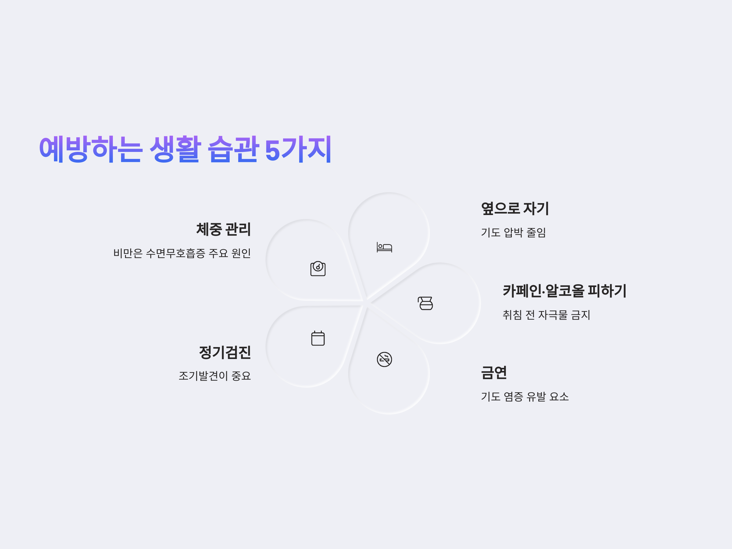 - 금연: 흡연은 기도 염증을 유발해 수면무호흡증과 심장질환 모두의 위험 요소입니다.