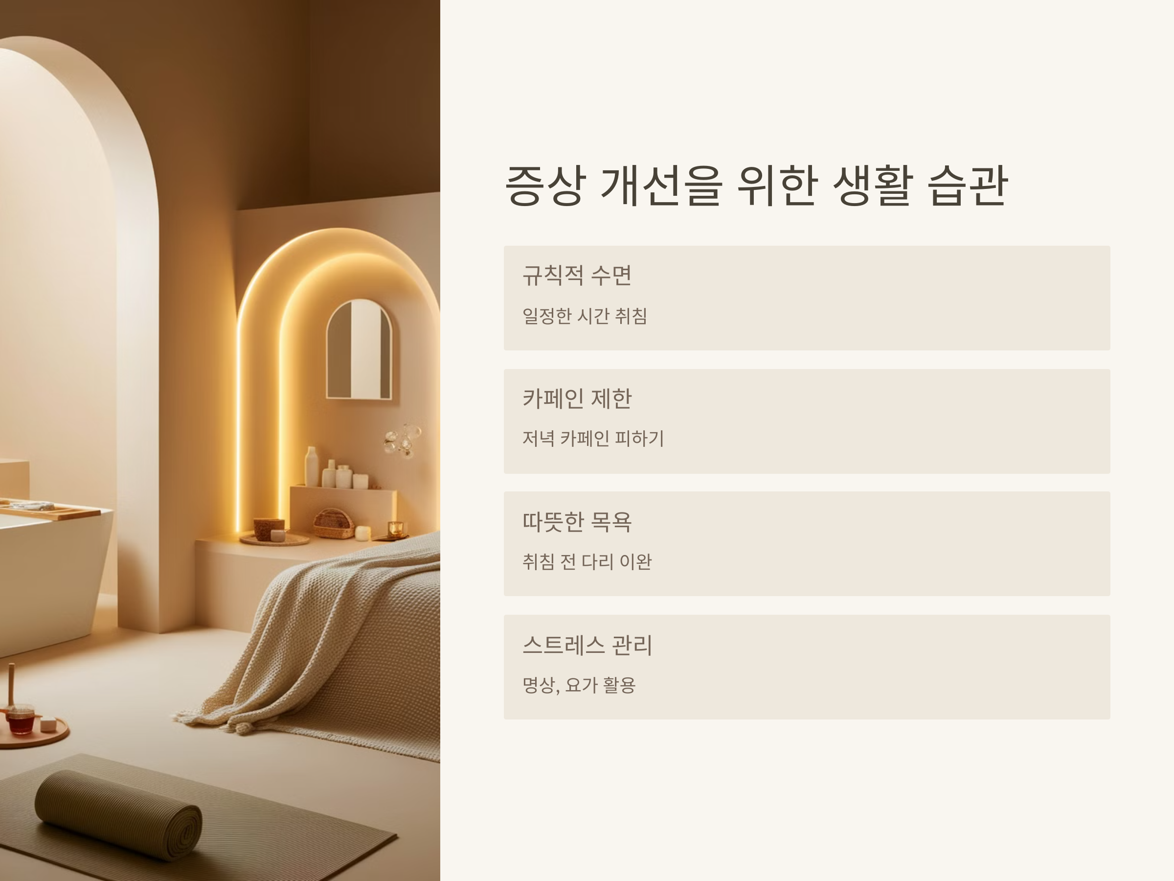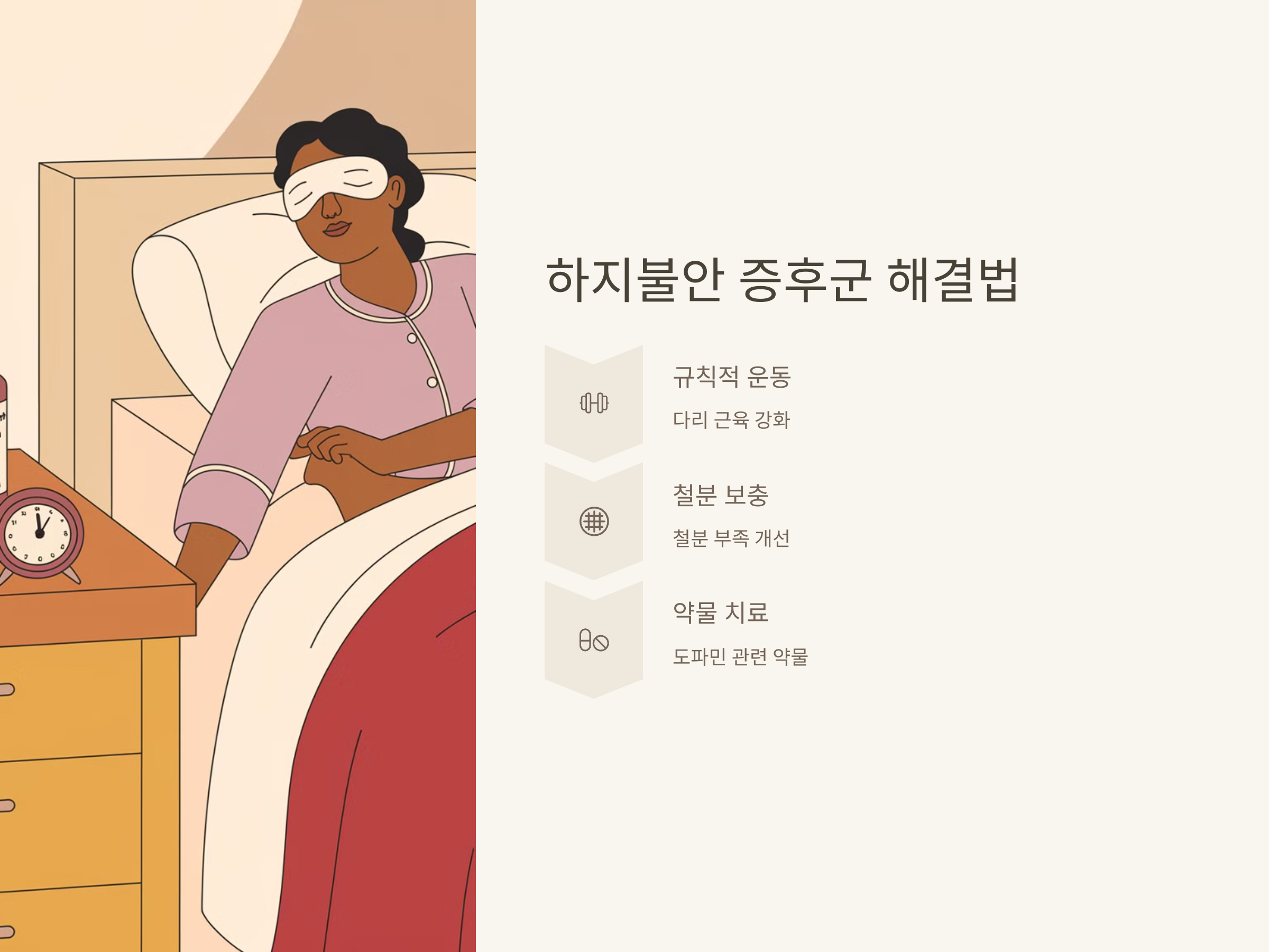 - 하지불안 증후군: 규칙적인 운동과 철분 보충이 도움이 될 수 있으며, 증상이 심할 경우 약물 치료를 고려할 수 있습니다.