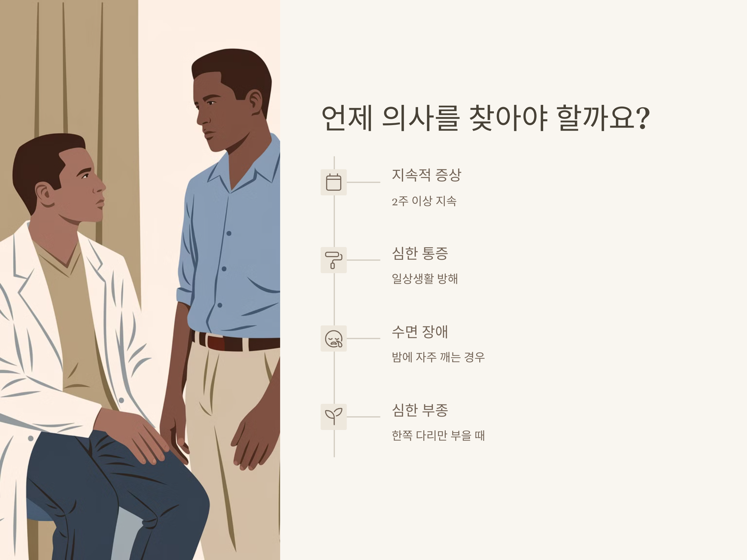 - 밤에 증상이 악화됨: 증상은 주로 밤에 심해지고, 특히 잠자리에 들 때 더욱 강하게 느껴집니다.