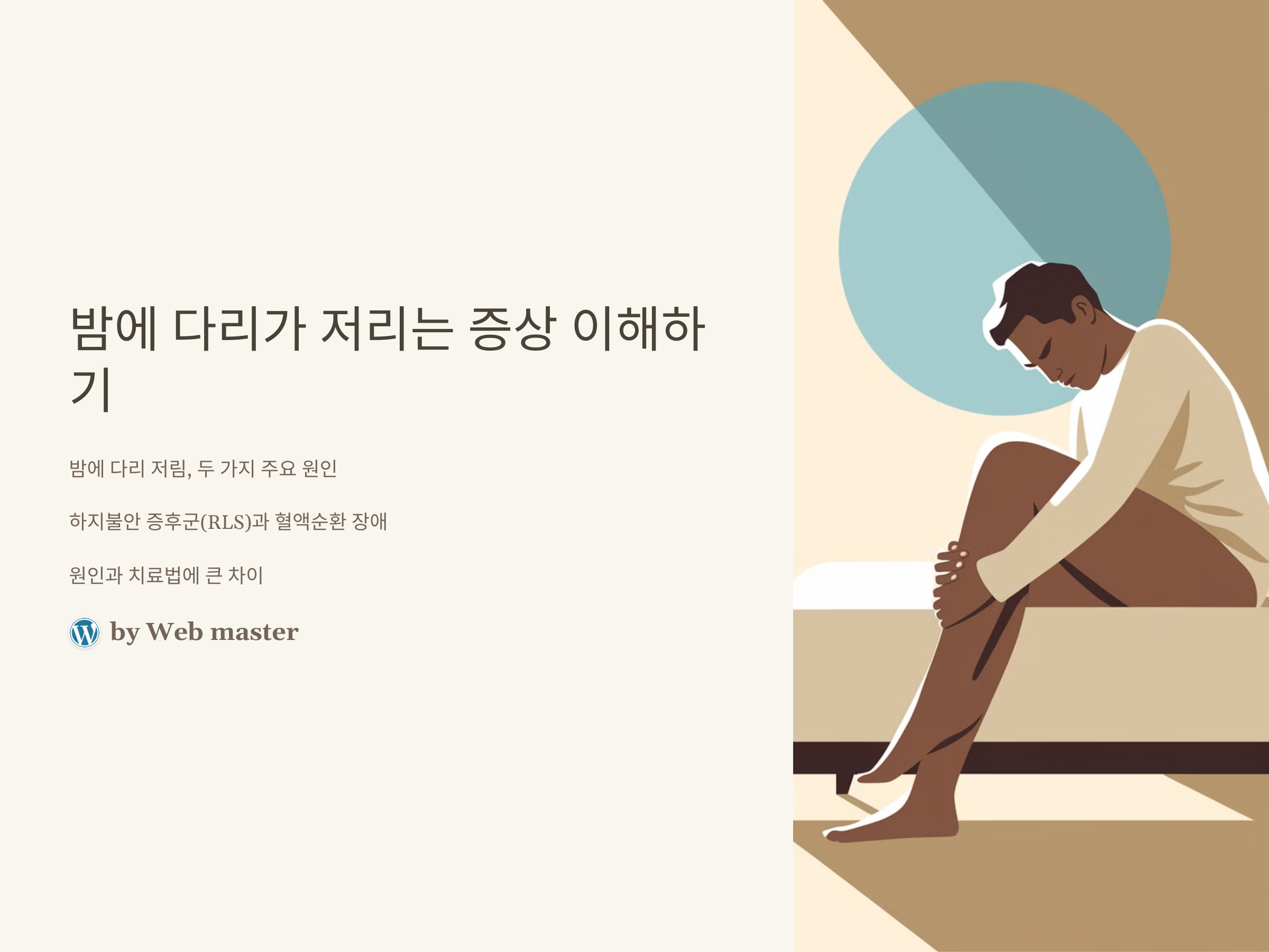 밤에 다리가 저리고 불편한 증상은 많은 사람들이 경험하는 문제로, 이는 일상생활에 큰 영향을 미칠 수 있습니다. 특히 다리 통증이나 불편함을 느낄 때, 두 가지 주요 원인이 떠오릅니다. 바로 하지불안 증후군(RLS)과 혈액순환 장애입니다. 이 두 가지 증상은 겉보기에 비슷할 수 있지만, 그 원인과 치료 방법에서 큰 차이가 있습니다. 그러므로 이 두 가지 증상을 구분하는 것이 중요합니다. 이 글에서는 하지불안 증후군과 혈액순환 장애의 차이점과 각각의 해결 방법에 대해 살펴보겠습니다.