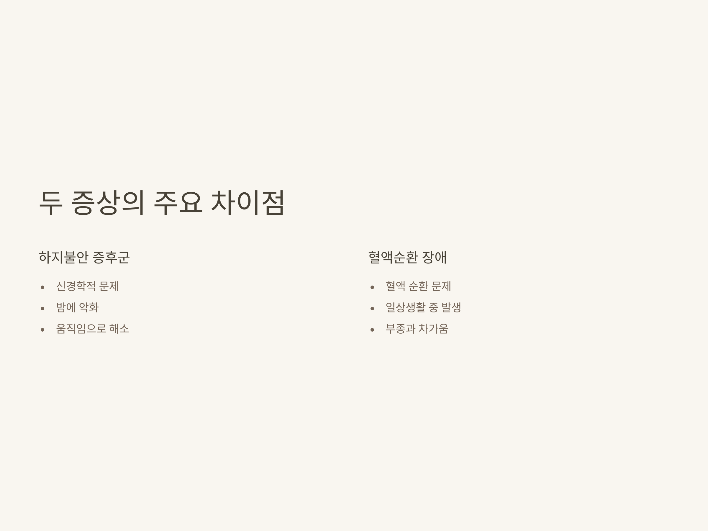 - 원인: 하지불안 증후군은 신경학적인 문제로, 다리를 움직이고 싶은 충동을 유발합니다. 반면, 혈액순환 장애는 혈액이 제대로 순환되지 않아서 다리의 불편함을 초래합니다.
