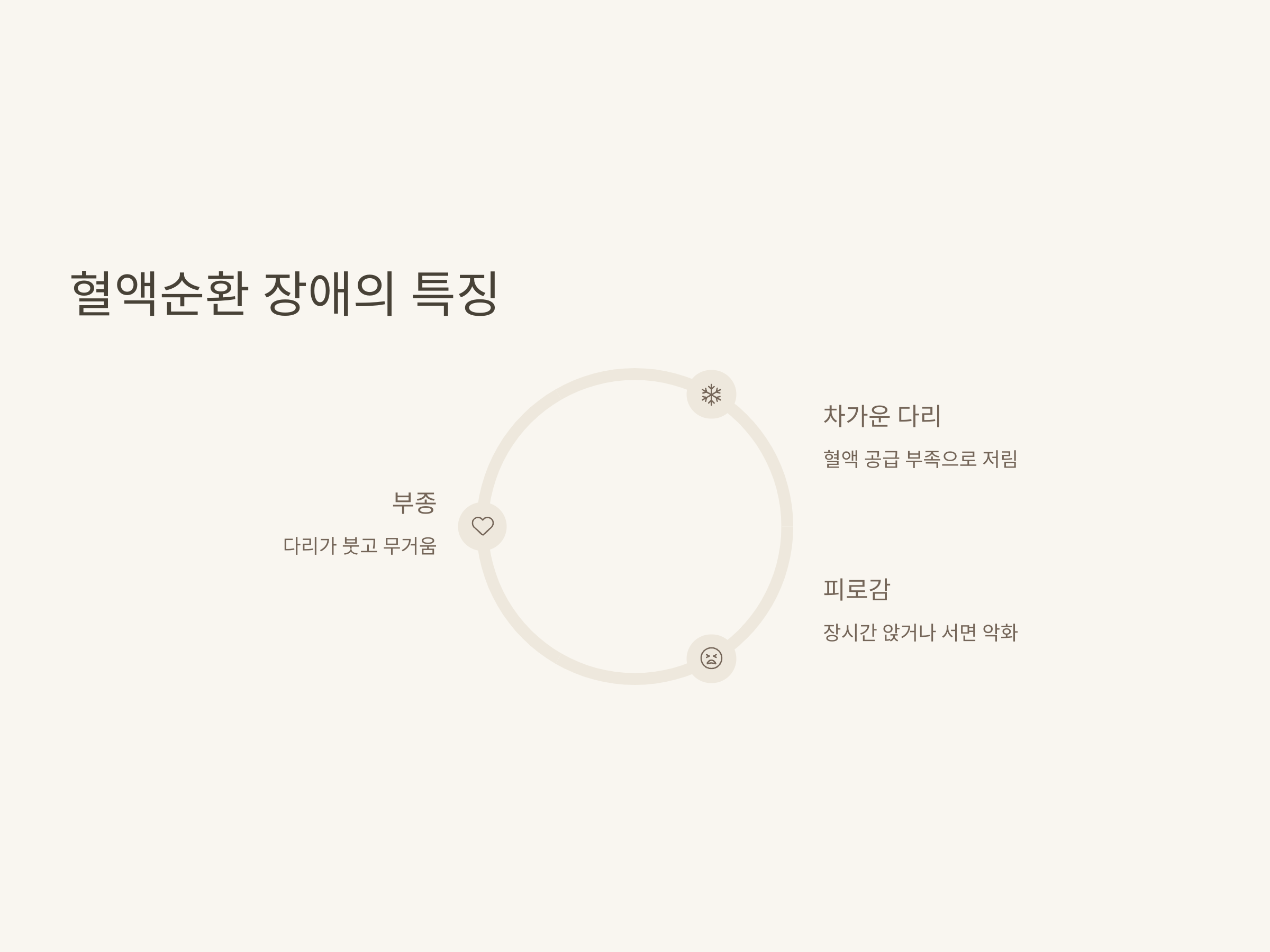 - 피로감: 장시간 서 있거나 앉아 있으면 다리가 피로하고 무겁게 느껴질 수 있습니다.