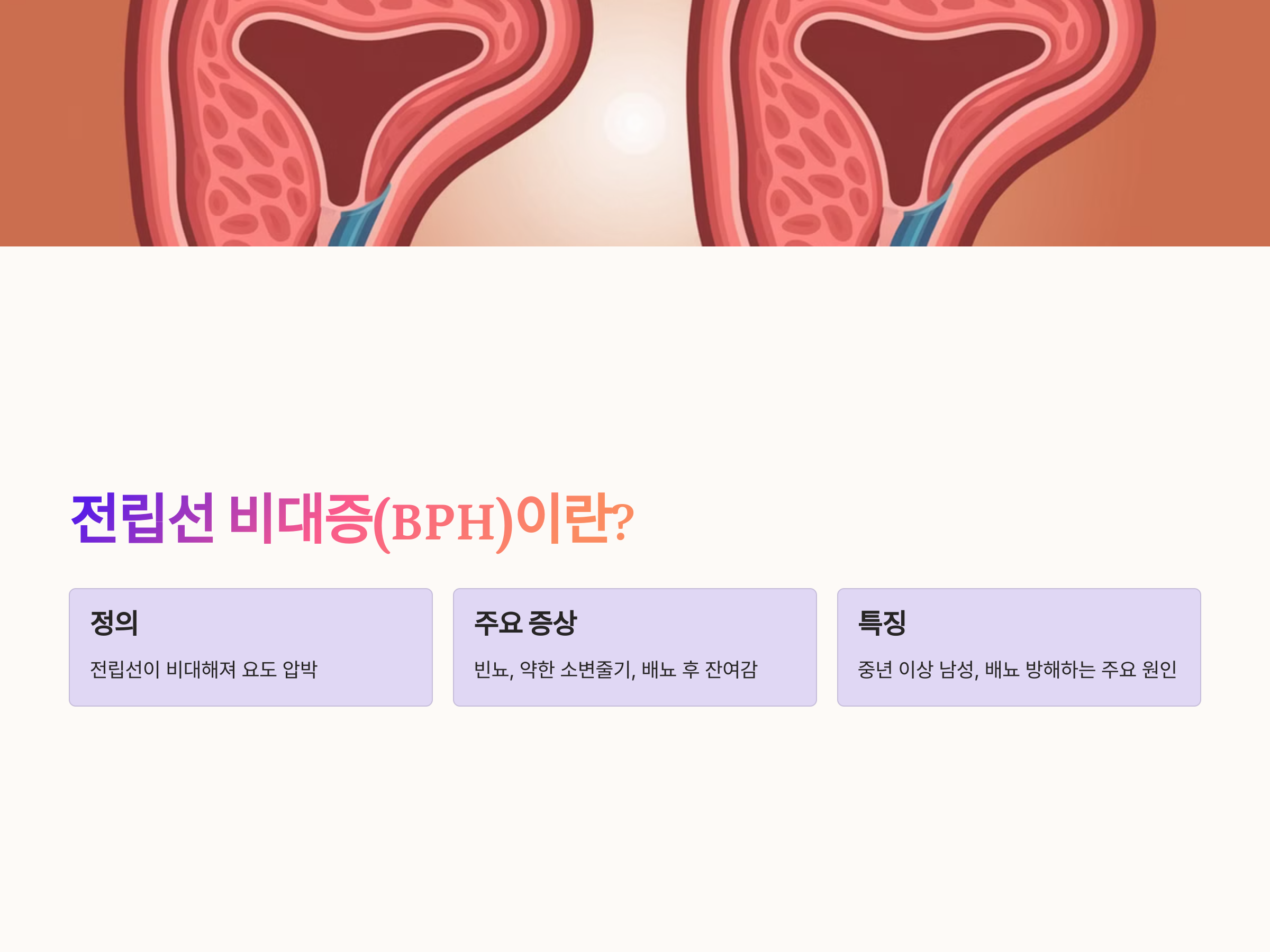전립선 비대증(BPH)은 중년 이상의 남성에서 흔히 나타나는 질환으로, 전립선이 비대해져 요도를 압박하고 소변 배출을 방해하는 상태입니다. 전립선은 방광 바로 아래에 위치하며, 남성의 생식 기관 중 중요한 역할을 합니다. 비대해진 전립선은 방광을 자극하여 배뇨에 문제를 일으킬 수 있습니다.