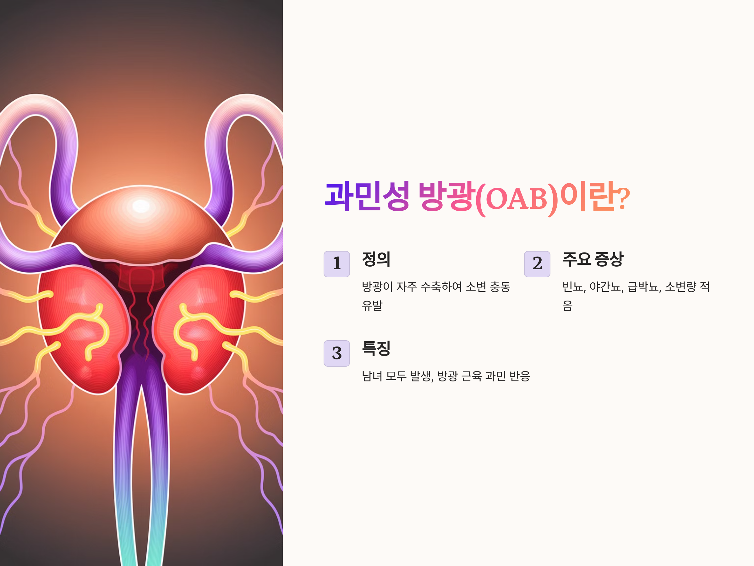 과민성 방광(OAB)은 방광이 자주 수축하여 소변을 자주 보고 싶은 충동을 일으키는 상태를 말합니다. 이는 나이와 상관없이 발생할 수 있으며, 주로 방광의 근육이 지나치게 예민하게 반응할 때 나타납니다. 과민성 방광은 방광이 "배뇨 신호"를 잘못 해석하여 일어나는 증상입니다.