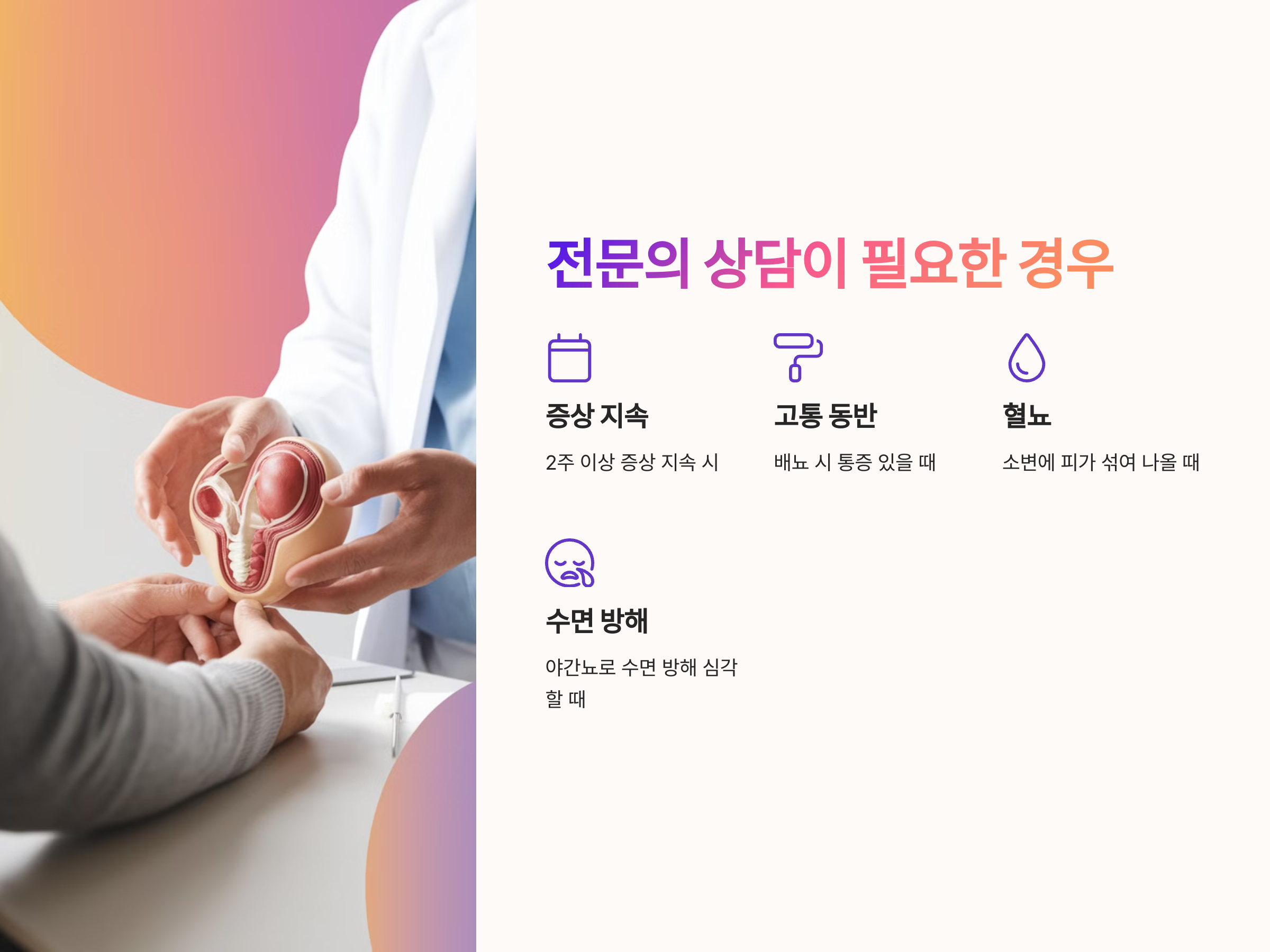 - 배뇨 후 잔여감: 소변을 본 후에도 여전히 방광에 소변이 남아 있는 느낌을 받을 수 있습니다.