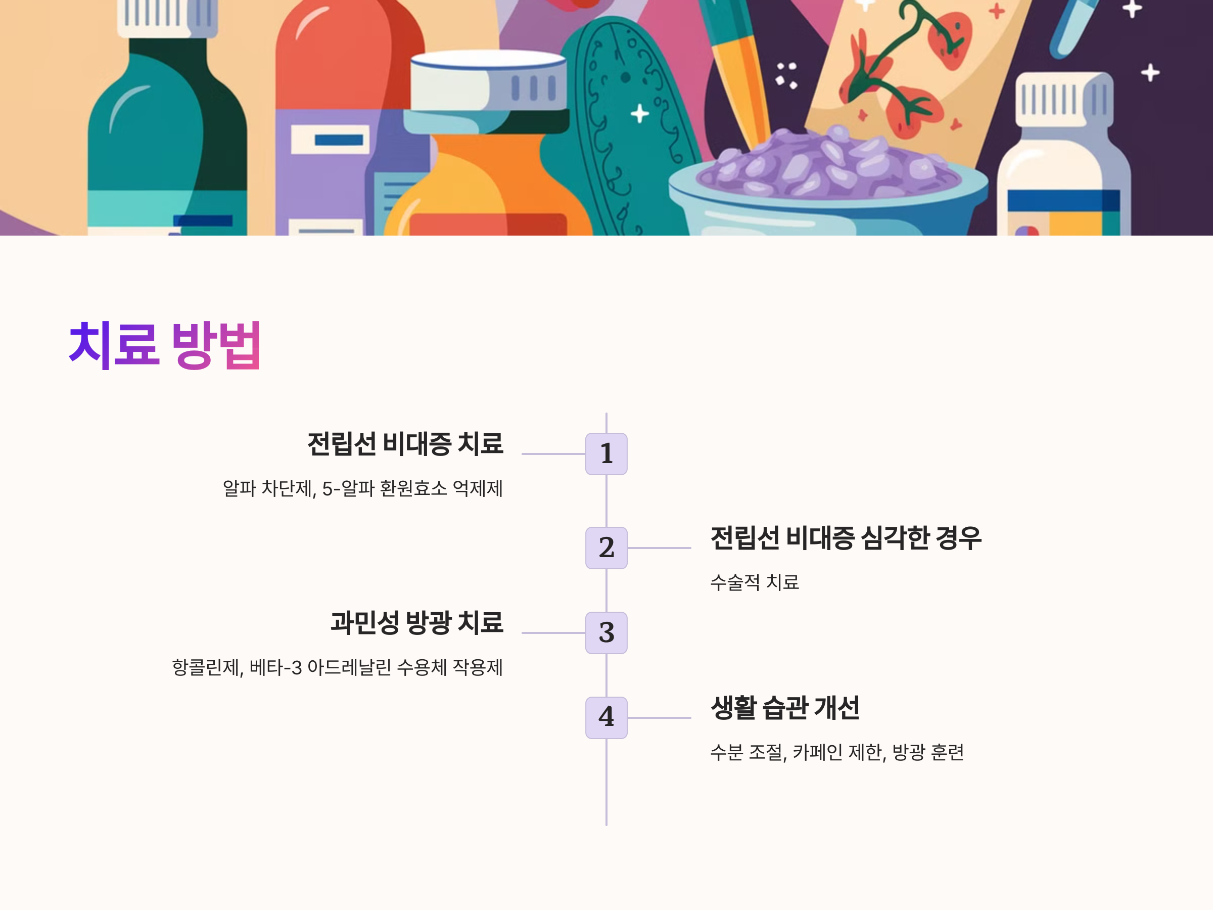 - 전립선 비대증은 약물 치료(알파 차단제, 5-알파 환원효소 억제제)나 수술적 치료가 필요할 수 있습니다.