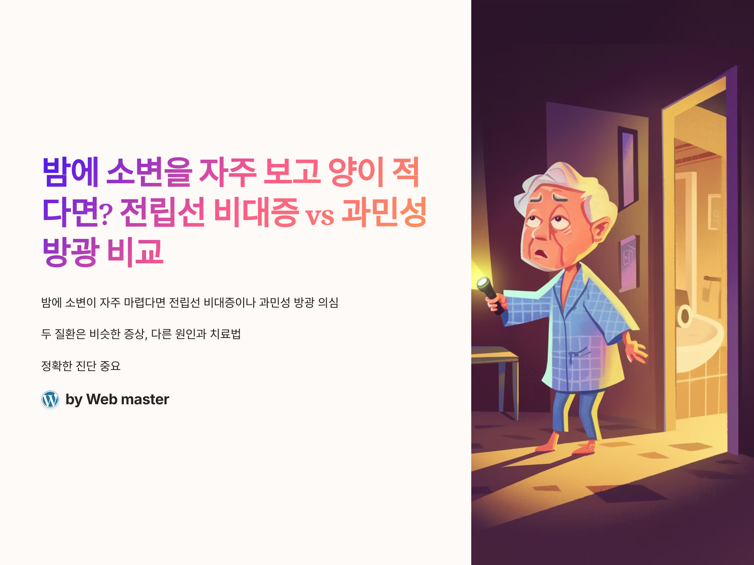밤에 자주 소변을 보게 되면 불편함을 느끼고, 이는 생활에 큰 영향을 미칠 수 있습니다. 특히 소변의 양이 적고 자주 보고 싶은 충동을 느낀다면 전립선 비대증이나 과민성 방광을 의심할 수 있습니다. 이 두 가지 상태는 비슷한 증상을 보일 수 있지만, 원인과 치료 방법이 달라서 정확한 진단이 중요합니다. 이 글에서는 전립선 비대증과 과민성 방광의 주요 증상, 차이점, 그리고 진단 방법에 대해 알아보겠습니다.
