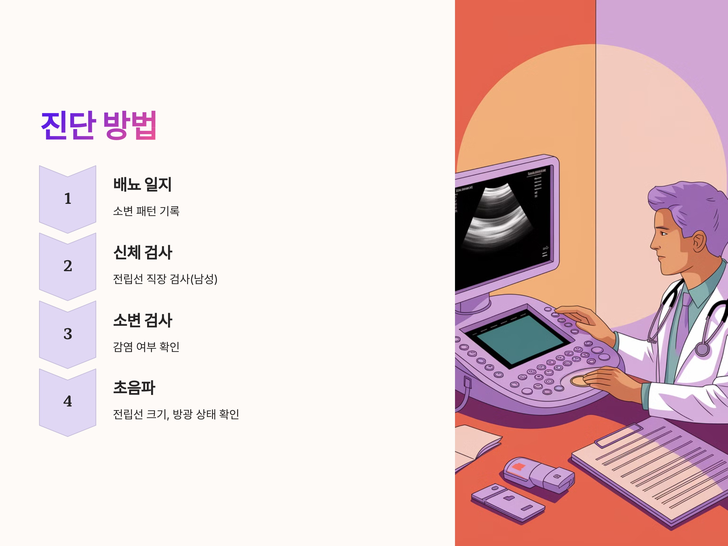 전립선 비대증이 의심될 경우, 의사는 전립선 초음파와 직장 검사(디지털 직장 촉지검사)를 통해 전립선의 크기와 상태를 확인합니다. 또한, 요속 검사를 통해 소변 배출 상태를 확인할 수도 있습니다.