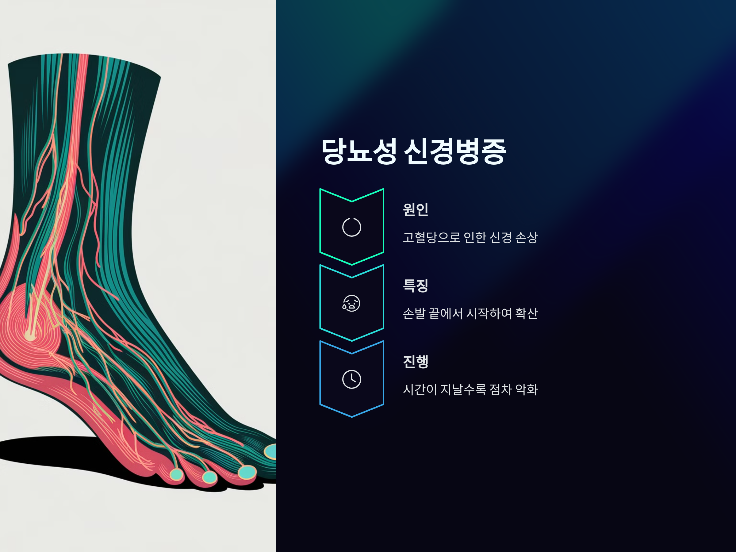 당뇨성 신경병증은 당뇨병 환자에게서 자주 발생하는 합병증 중 하나입니다. 이 질환은 고혈당이 지속적으로 신경에 영향을 미쳐, 말초신경을 손상시키는 특징이 있습니다. 손발에 저리고 화끈거리는 증상이 자주 발생하며, 이는 주로 밤에 더 심해지는 경향이 있습니다. 당뇨병을 오래 앓고 있는 사람일수록 신경병증의 위험이 높아집니다.