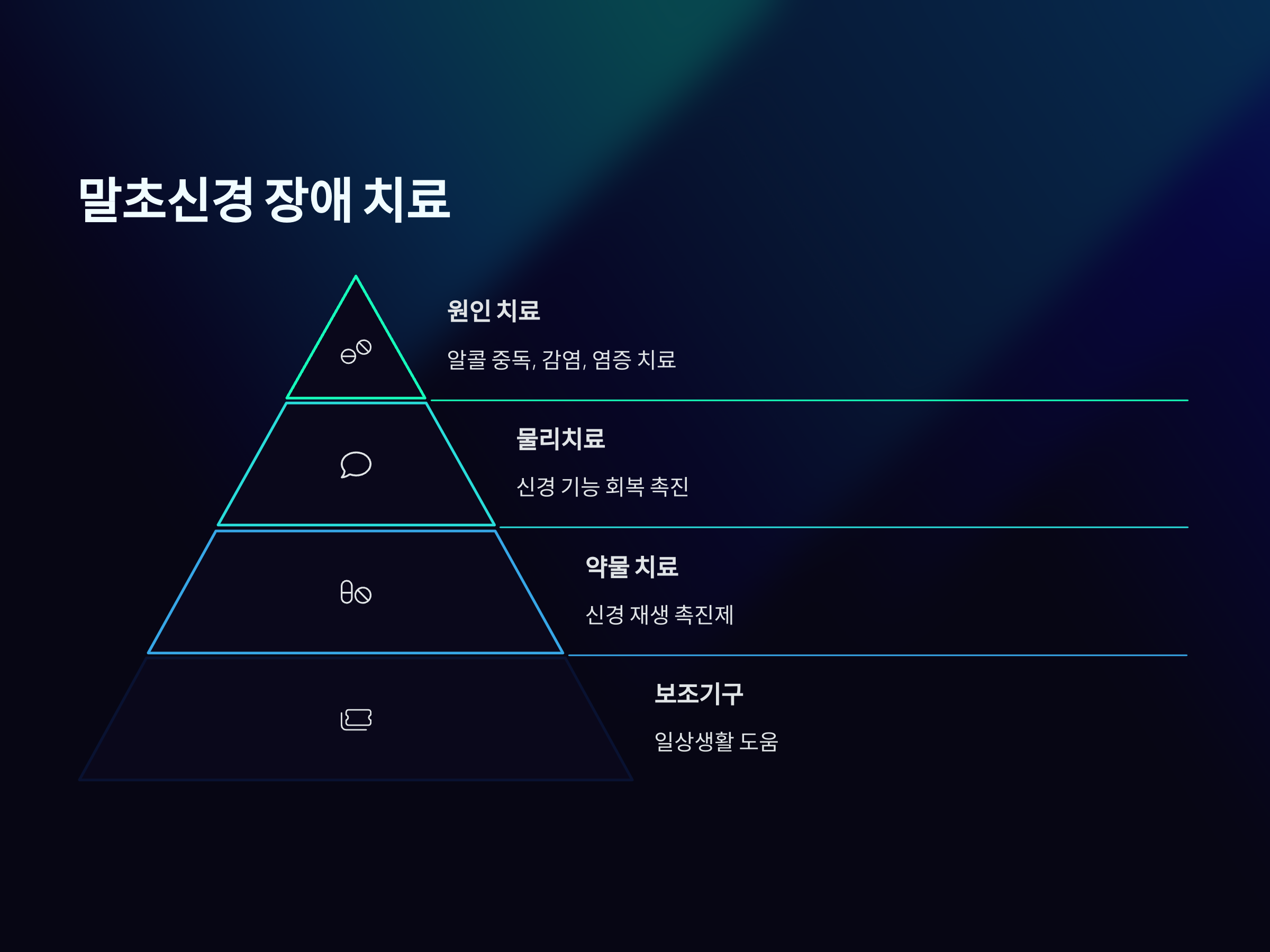 말초신경 장애의 경우, 손상된 신경을 회복시키는 치료가 중요하지만, 신경 손상이 이미 심각한 경우에는 완전한 회복이 어려울 수 있습니다. 이 경우에는 증상 완화를 위한 치료가 중심이 됩니다. 물리치료와 함께 신경 재생을 촉진하는 약물이나 보조기구를 사용하는 것도 방법입니다.