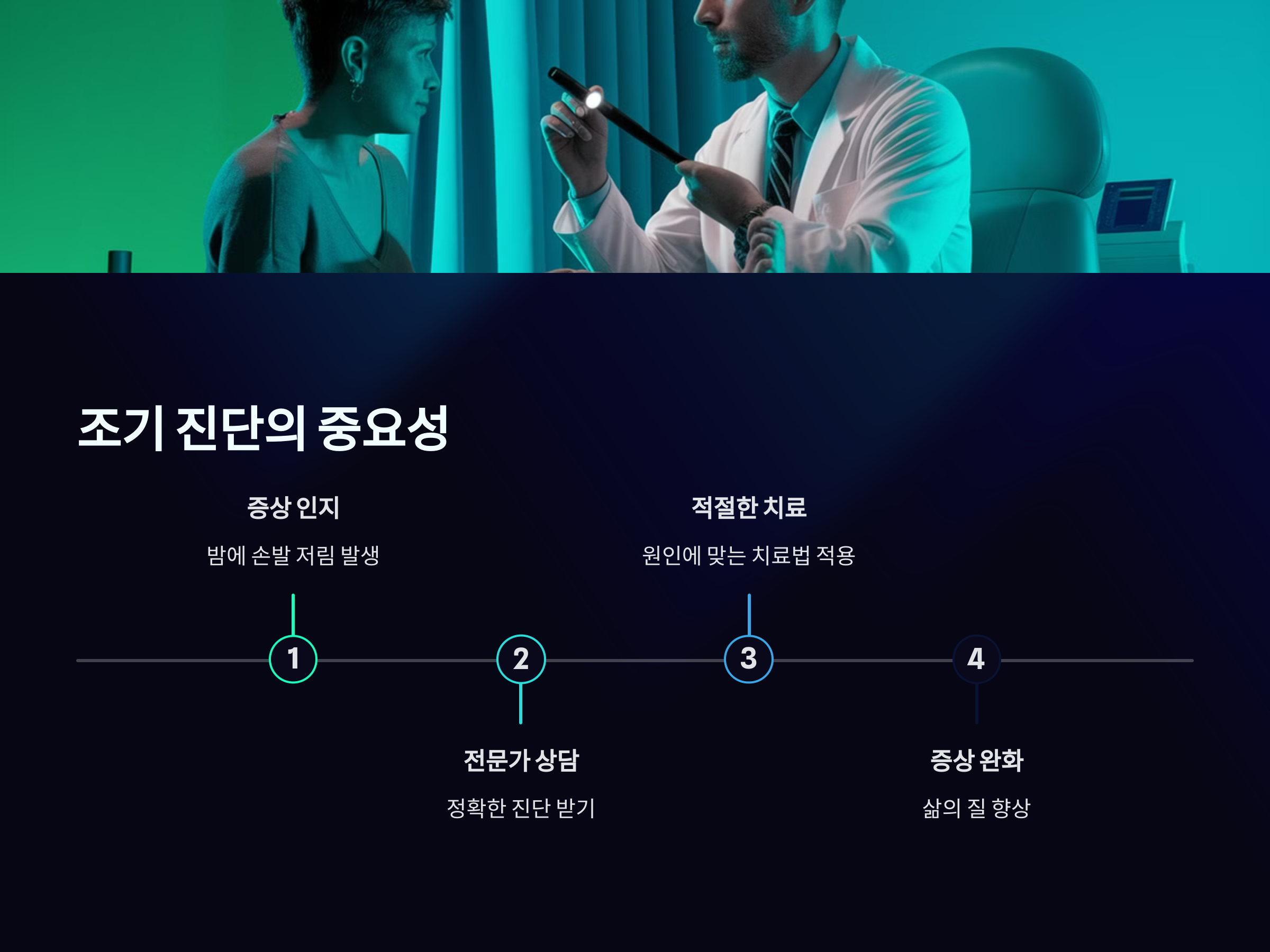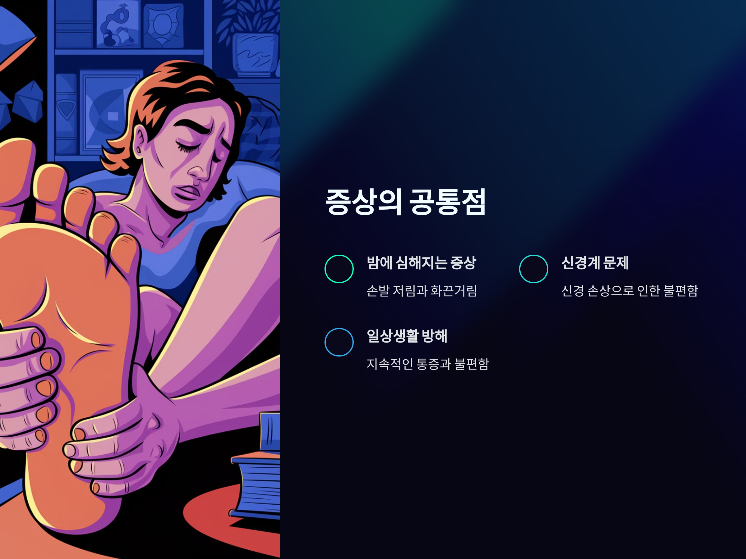 밤에 손발이 화끈거리고 저리는 증상은 당뇨성 신경병증과 말초신경 장애 모두에서 나타날 수 있습니다. 하지만 이 두 질환은 원인과 치료 방법에서 차이가 있으므로, 정확한 진단을 받는 것이 중요합니다. 당뇨병이 원인이라면 혈당 관리가 가장 중요한 치료법이며, 말초신경 장애의 경우 다양한 원인에 따라 개별적인 치료가 필요합니다. 증상이 심해지기 전에 전문가와 상담하고, 적절한 치료를 받는 것이 중요합니다.