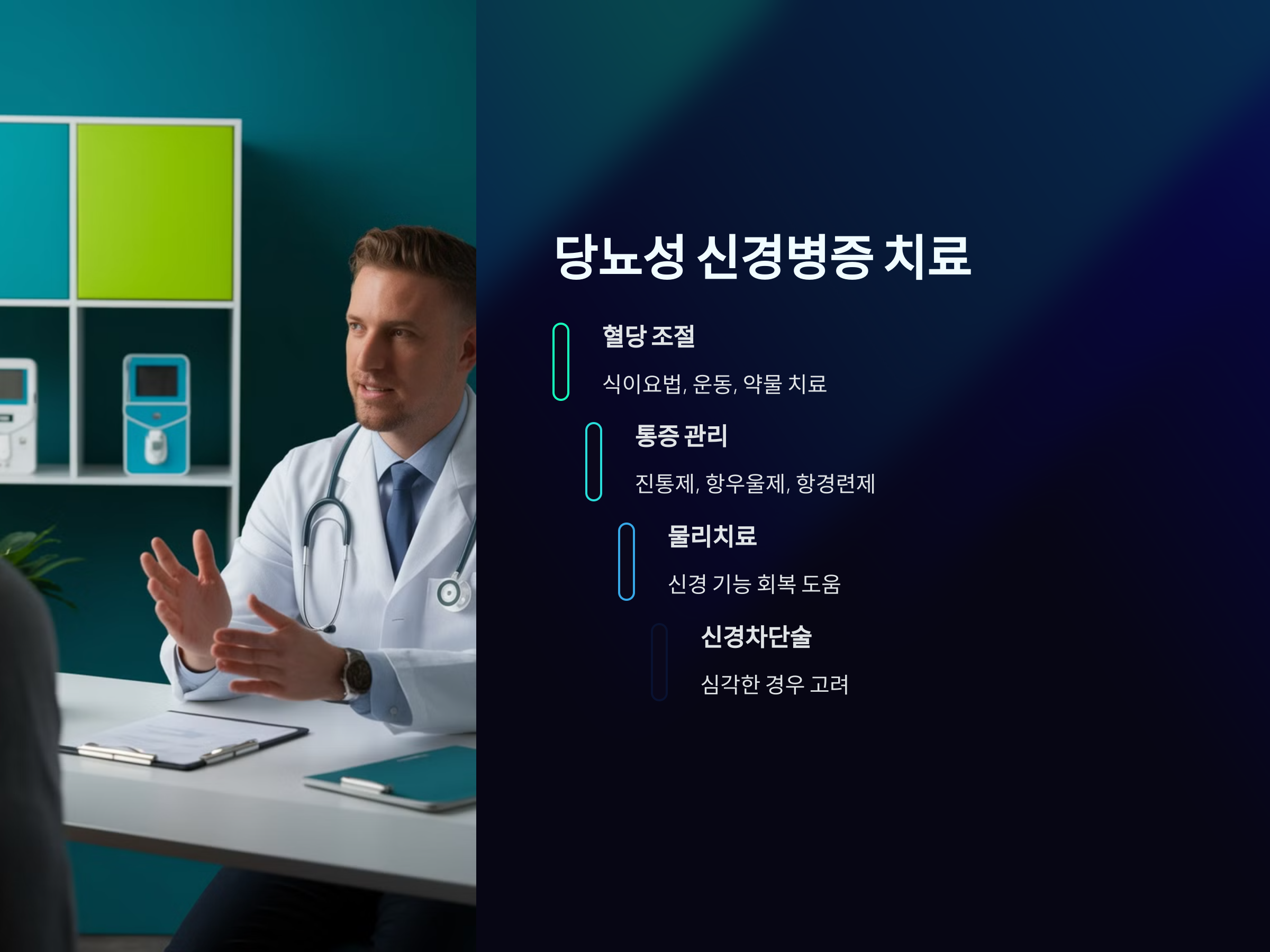 당뇨성 신경병증이 심각해지면, 신경에 대한 직접적인 치료가 필요할 수 있습니다. 예를 들어, 신경차단술이나 수술적인 방법을 고려할 수도 있습니다. 하지만 예방이 중요하며, 당뇨병을 철저히 관리하는 것이 가장 좋은 방법입니다.
