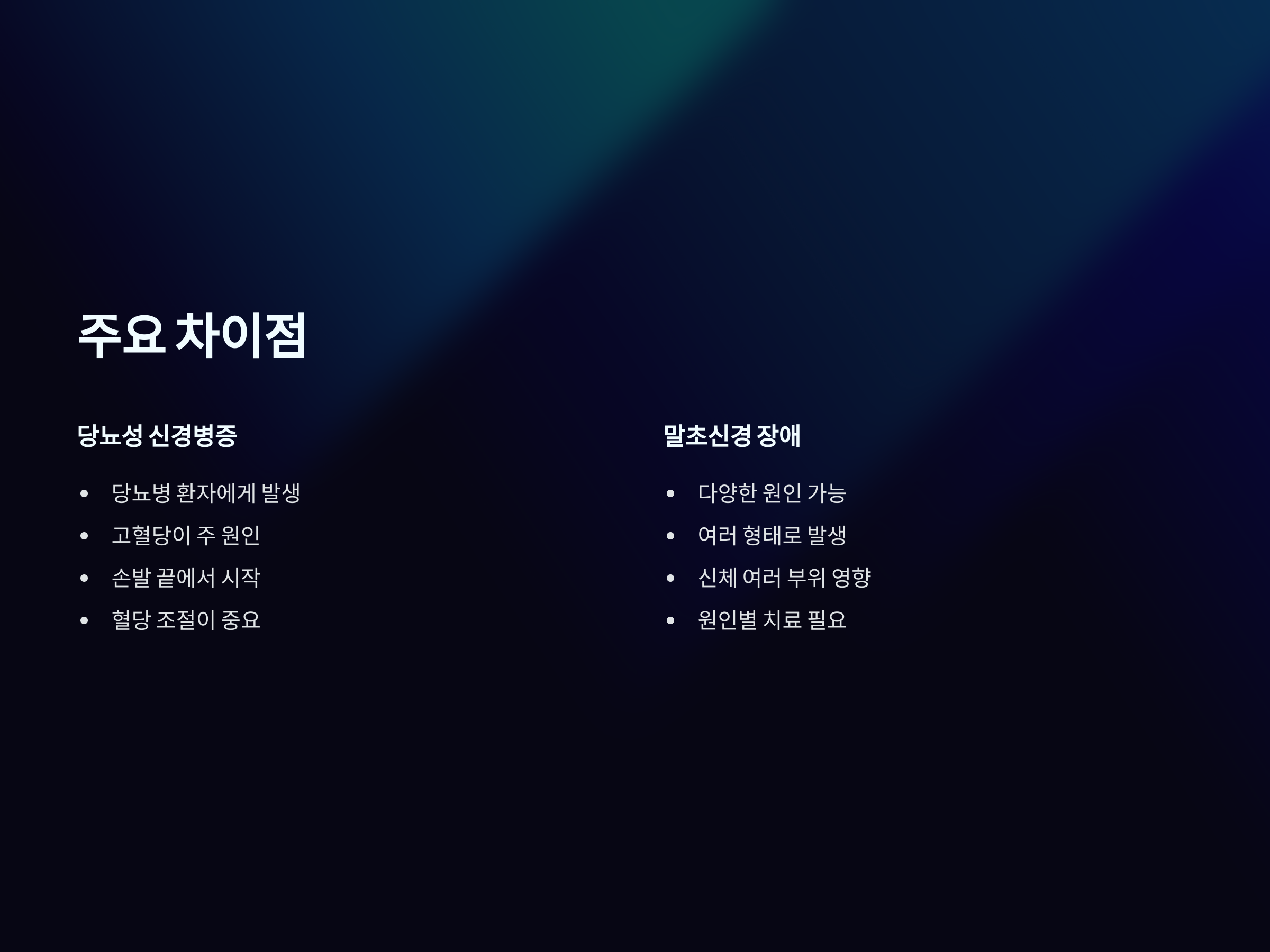 둘째, 당뇨성 신경병증은 시간이 지날수록 증상이 점차 악화되는 경향이 있으며, 혈당 조절이 중요한 치료 방법입니다. 반면, 말초신경 장애는 원인에 따라 다르게 치료가 필요하며, 물리치료, 약물 치료, 수술적 치료 등이 필요할 수 있습니다.