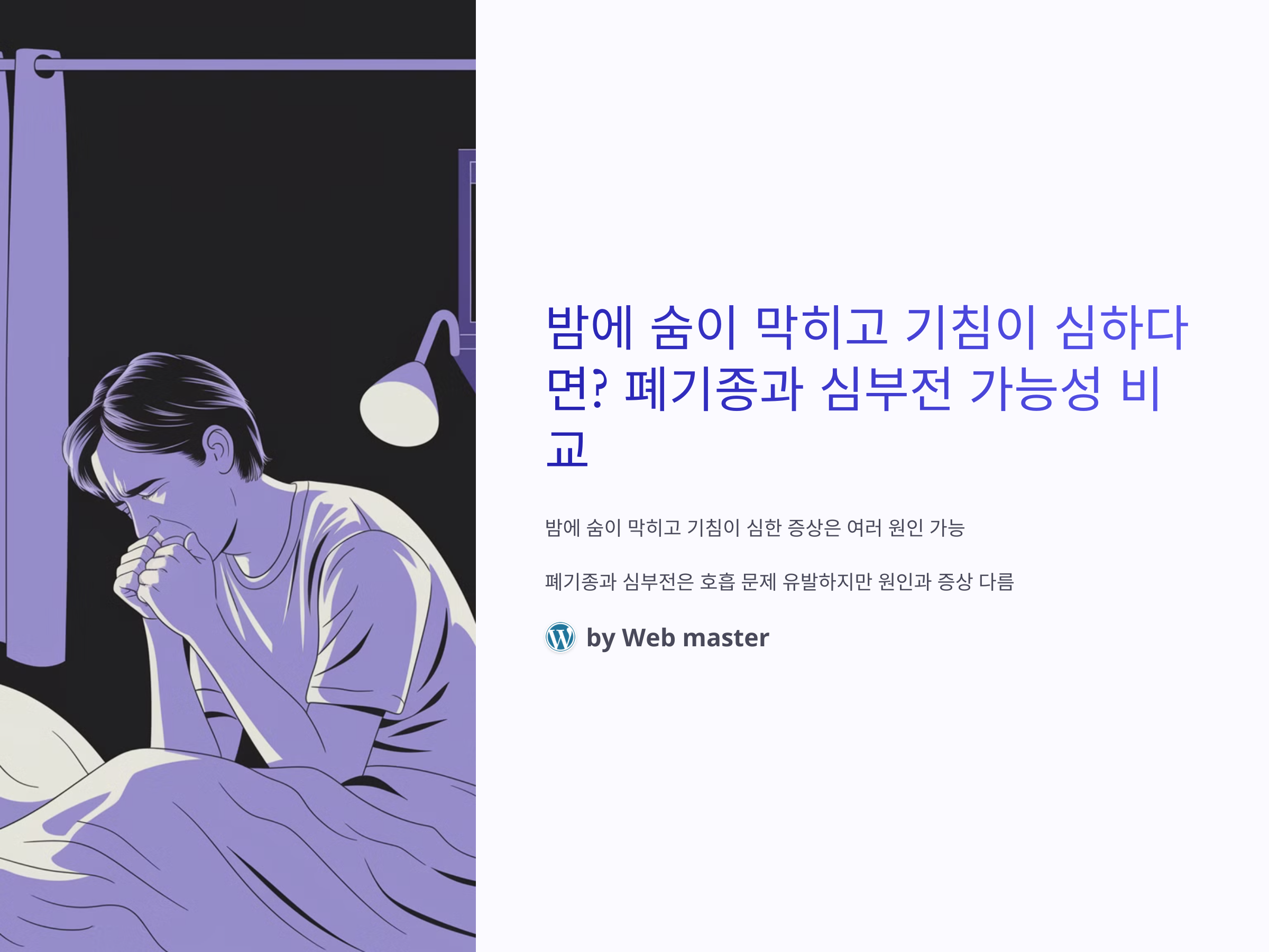 밤에 숨이 막히고 기침이 심한 증상은 많은 사람들이 경험할 수 있는 문제입니다. 그러나 이 두 증상은 여러 가지 원인에 의해 발생할 수 있기 때문에, 정확한 원인을 파악하는 것이 중요합니다. 폐기종과 심부전은 둘 다 호흡에 영향을 미치는 질환이지만, 그 원인과 증상은 다를 수 있습니다. 이 글에서는 폐기종과 심부전의 특징을 비교하고, 어떤 상황에서 각 질병이 의심될 수 있는지 살펴보겠습니다.