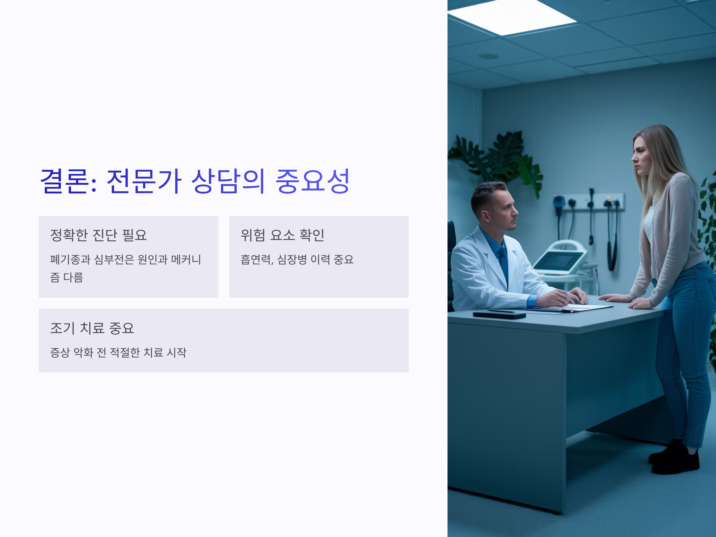 또한, 폐기종은 주로 흡연과 관련이 있으며, 호흡기계에 문제가 발생하는 반면, 심부전은 심장의 문제로 인해 발생하는 질환입니다. 두 질환 모두 밤에 증상이 악화되는 경향이 있지만, 그 원인과 기전은 다릅니다.
