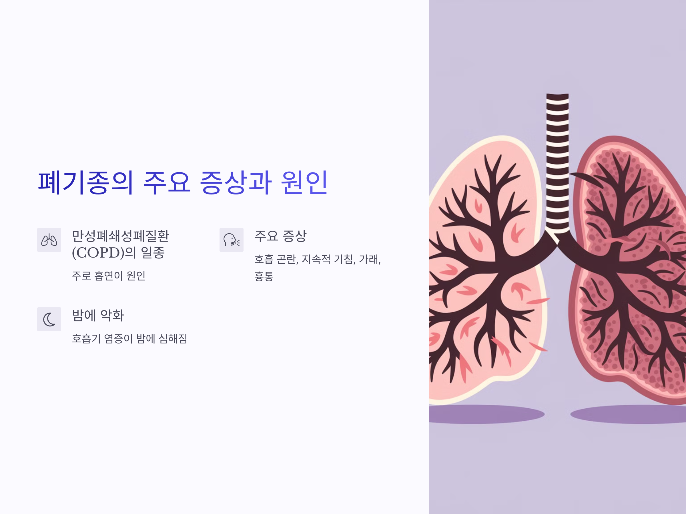 폐기종은 만성폐쇄성폐질환(COPD)의 일종으로, 주로 담배 흡연이 주요 원인입니다. 폐의 작은 공기주머니인 폐포가 손상되어 산소와 이산화탄소 교환이 제대로 이루어지지 않게 됩니다. 이로 인해 호흡이 어려워지고, 기침과 가래가 동반됩니다. 특히 기침이 아침에 심하고, 밤에 더 심해지는 경향이 있습니다.