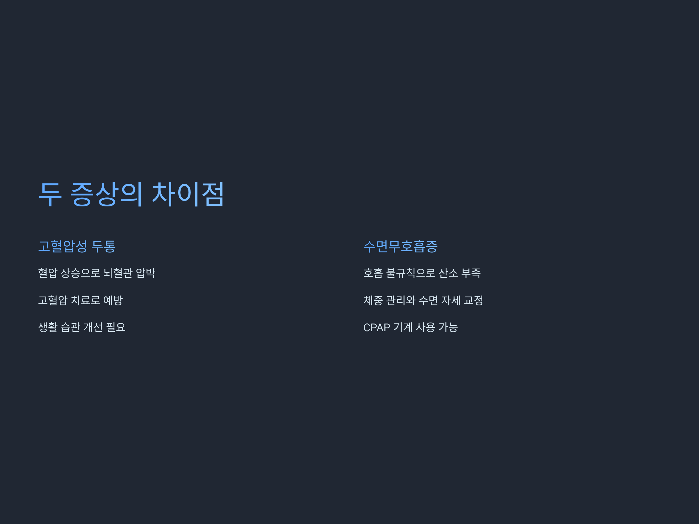 고혈압성 두통은 주로 고혈압 치료를 통해 예방할 수 있으며, 혈압 관리와 함께 생활 습관 개선이 필요합니다. 수면무호흡증은 체중 관리와 수면 자세 교정, 그리고 필요시 CPAP(Continuous Positive Airway Pressure) 기계를 사용하는 것이 중요합니다. 두 가지 모두 치료하지 않으면 더 심각한 합병증을 일으킬 수 있기 때문에, 적절한 관리와 예방이 필요합니다.