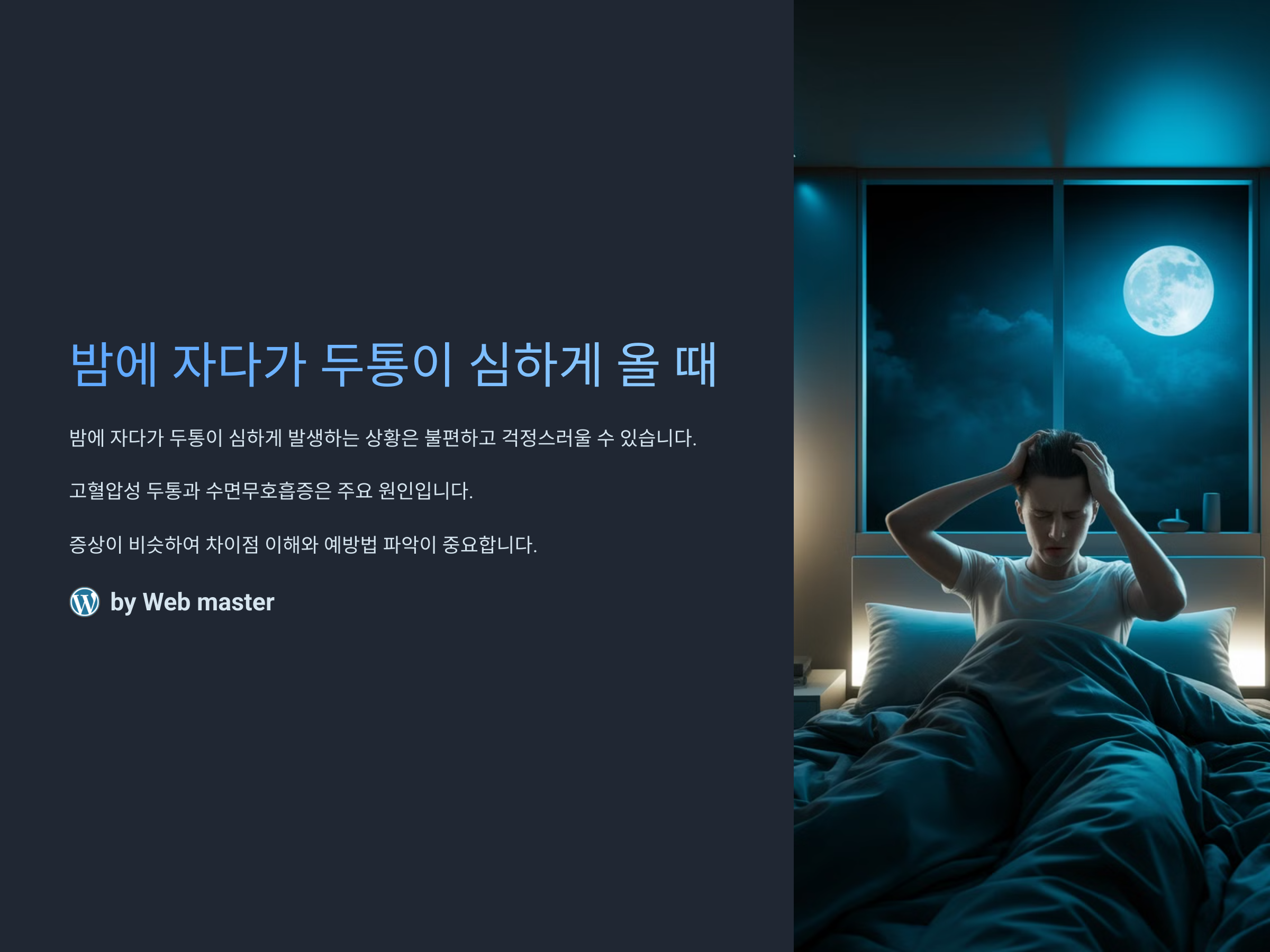 밤에 자다가 두통이 심하게 발생하는 상황은 꽤 불편하고 걱정스러울 수 있습니다. 이 두통은 다양한 원인으로 발생할 수 있으며, 그 중에서 고혈압성 두통과 수면무호흡증은 매우 중요한 원인입니다. 두 가지 모두 증상이 비슷할 수 있기 때문에, 차이를 이해하고 적절한 예방 방법을 찾는 것이 중요합니다. 오늘은 고혈압성 두통과 수면무호흡증에 대해 알아보고, 이를 예방하기 위한 방법을 소개하겠습니다.