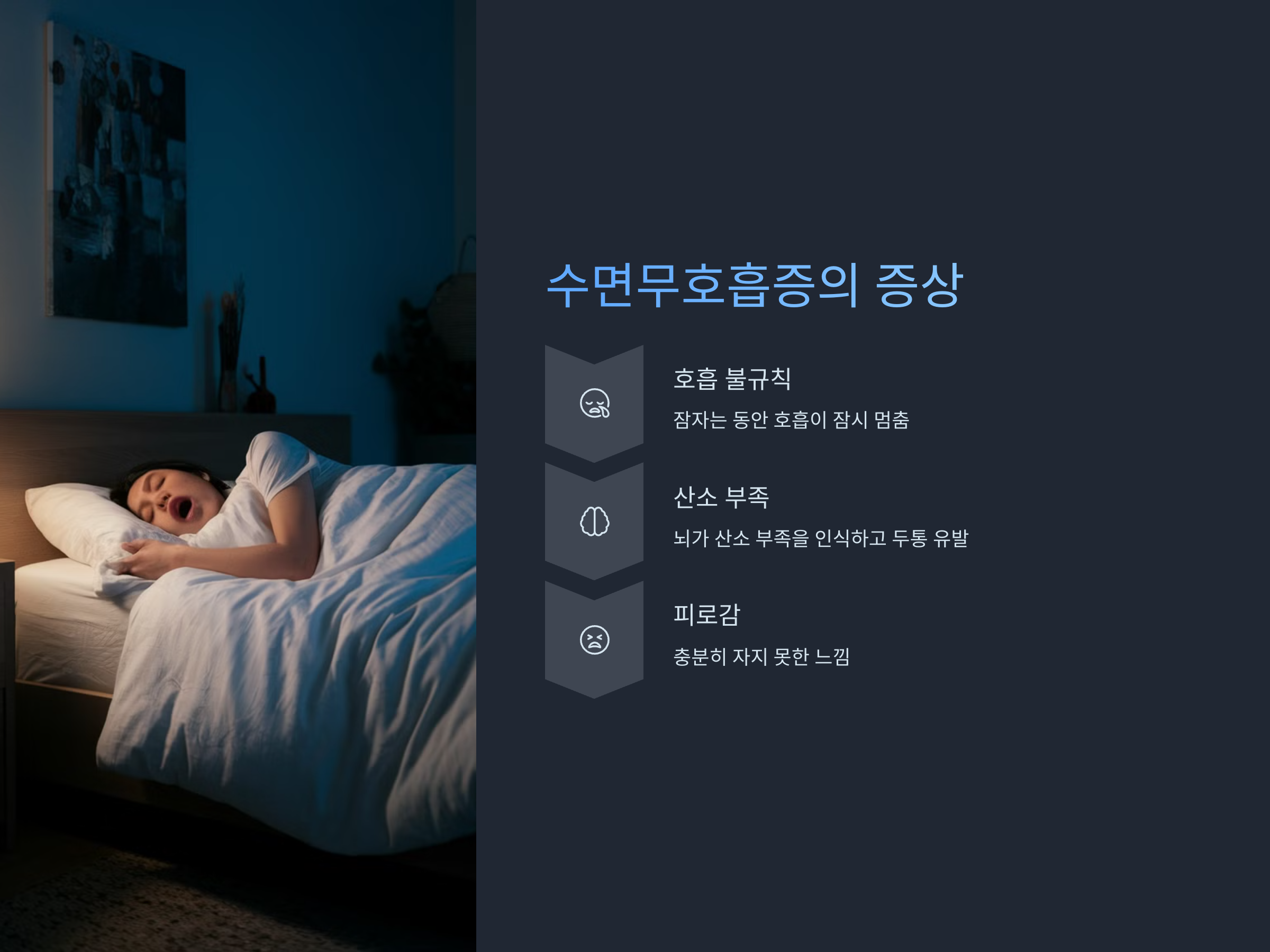 수면무호흡증은 잠자는 동안 호흡이 잠시 멈추거나 불규칙하게 되는 질환으로, 두통을 유발할 수 있습니다. 특히, 밤에 자다가 두통을 느낄 때, 수면무호흡증이 원인일 수 있습니다. 수면무호흡증은 호흡이 멈추면서 산소 공급이 부족해져 뇌가 산소 부족을 인식하고 두통을 유발합니다. 이는 대개 아침에 일어나자마자 심한 두통을 동반하며, 잠을 충분히 자지 못했다는 느낌을 줍니다.