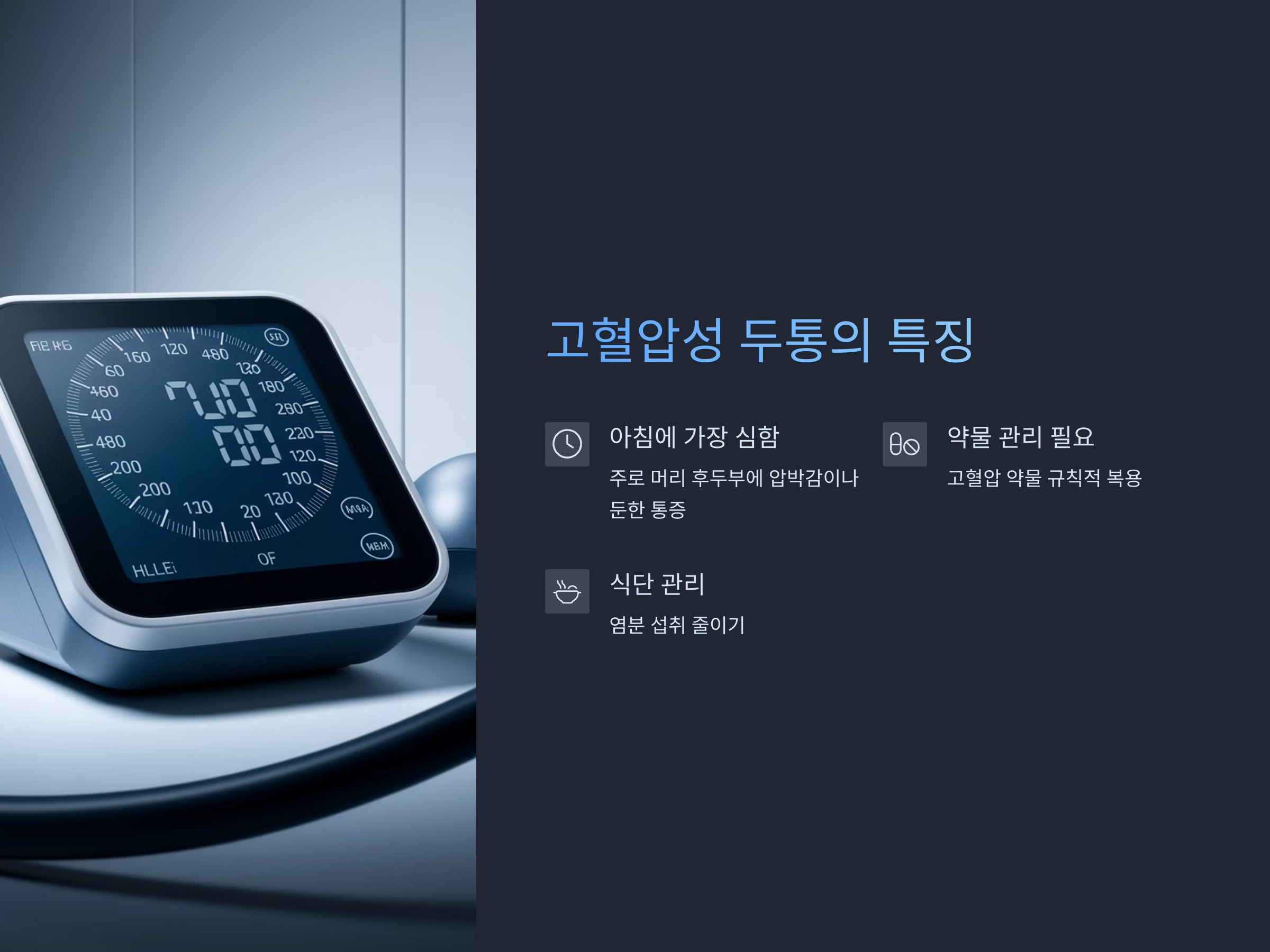 고혈압성 두통은 고혈압이 원인으로 발생하는 두통입니다. 특히 밤에 잠을 자다가 두통이 심하게 느껴질 수 있는데, 이는 고혈압이 제대로 조절되지 않아서 발생합니다. 고혈압성 두통은 대개 아침에 일어났을 때 가장 심하게 느껴지며, 주로 머리 후두부에서 압박감이나 둔한 통증으로 나타납니다.