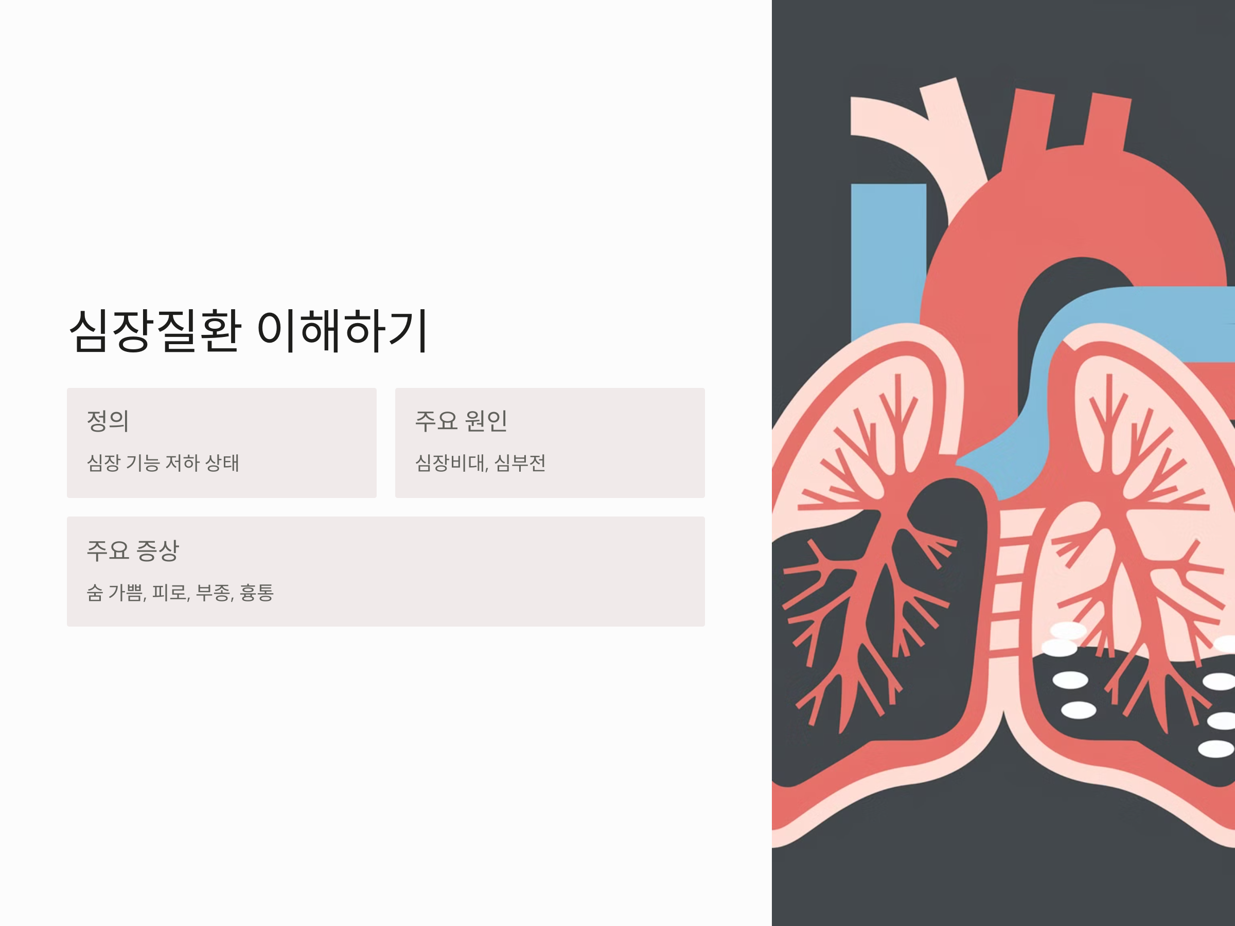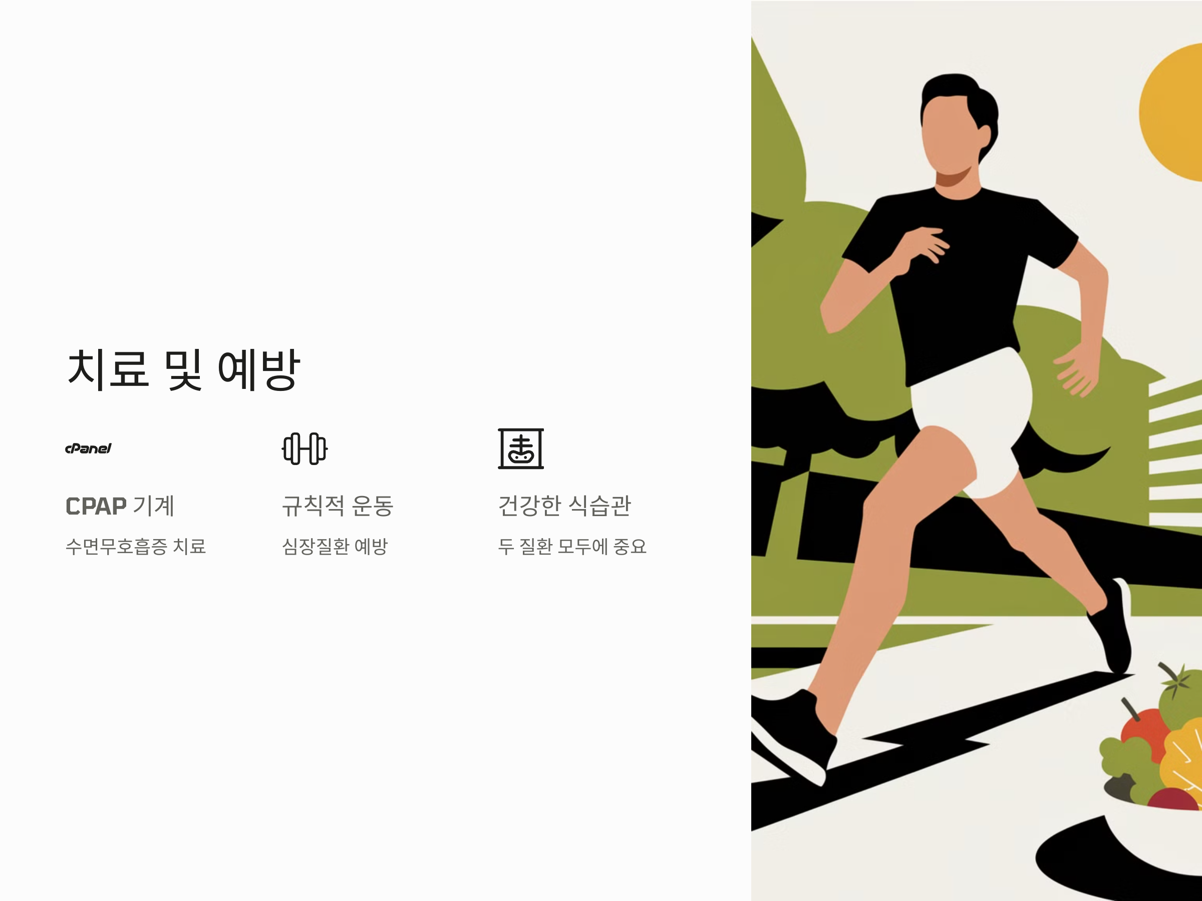 | 증상 | 코골이, 숨 막힘, 불규칙한 수면 | 숨 가쁨, 피로, 부종, 흉통 |