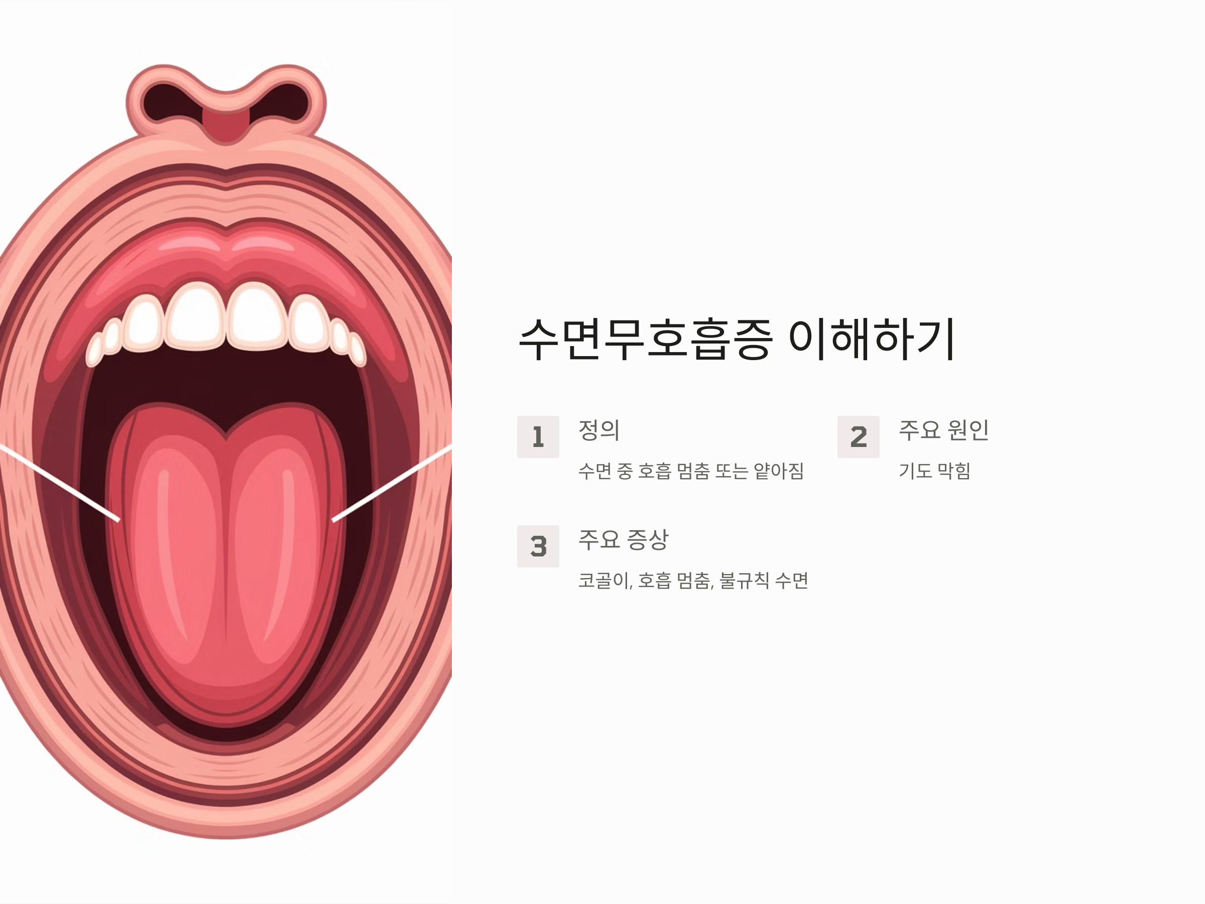 수면무호흡증은 자는 동안 일정 기간 호흡이 멈추거나 얕아지는 질환으로, 수면의 질에 심각한 영향을 미칩니다. 이 질환은 대개 코골이와 함께 나타나며, 자는 동안 자주 깨어나거나 숨을 제대로 쉬지 못하는 경험을 하게 됩니다. 수면무호흡증의 주요 원인 중 하나는 기도가 막히는 것입니다. 기도가 일시적으로 막히면 호흡이 멈추고, 뇌는 이 사실을 감지하여 다시 숨을 쉬기 위한 자극을 보냅니다. 이로 인해 수면의 질이 떨어지고, 낮에 피로감을 느끼는 경우가 많습니다.