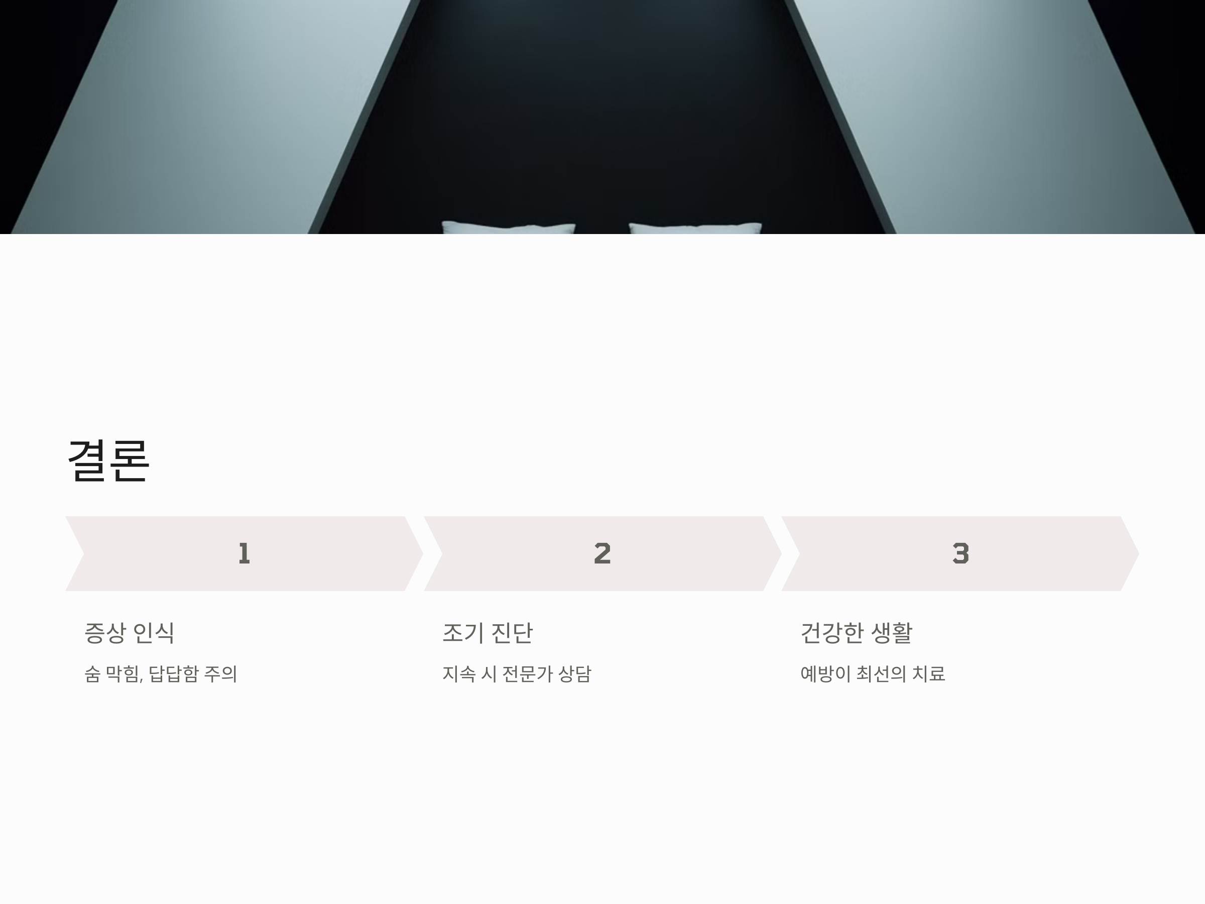 | 수면 중 증상 | 호흡 멈춤, 자주 깸 | 호흡 곤란, 답답함 |