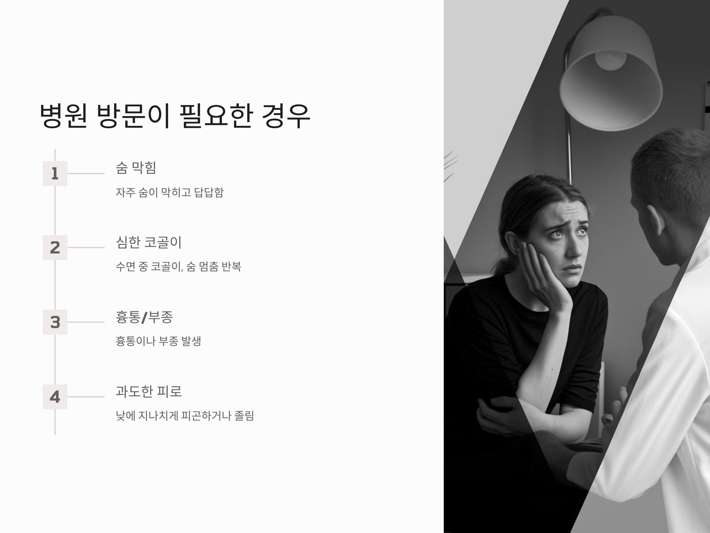 - 수면 중 코골이가 심한 경우: 심한 코골이나 숨이 멈추는 경험이 반복된다면, 수면무호흡증을 의심할 수 있습니다.