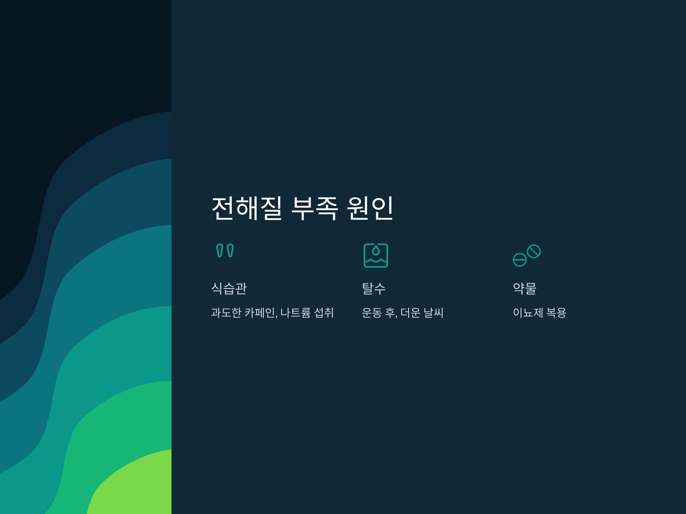 전해질 부족은 여러 가지 이유로 발생할 수 있습니다. 첫 번째는 식습관입니다. 과도한 카페인 섭취나 나트륨이 많은 음식을 자주 먹으면 전해질의 불균형이 생기기 쉽습니다. 두 번째로는 탈수입니다. 운동 후나 더운 날씨에 충분히 수분을 보충하지 않으면 전해질이 체내에서 제대로 기능하지 못합니다. 마지막으로 약물 복용도 전해질의 불균형을 초래할 수 있습니다. 특히 이뇨제를 복용하는 경우, 마그네슘과 칼륨의 배출이 증가하여 전해질이 부족해질 수 있습니다.