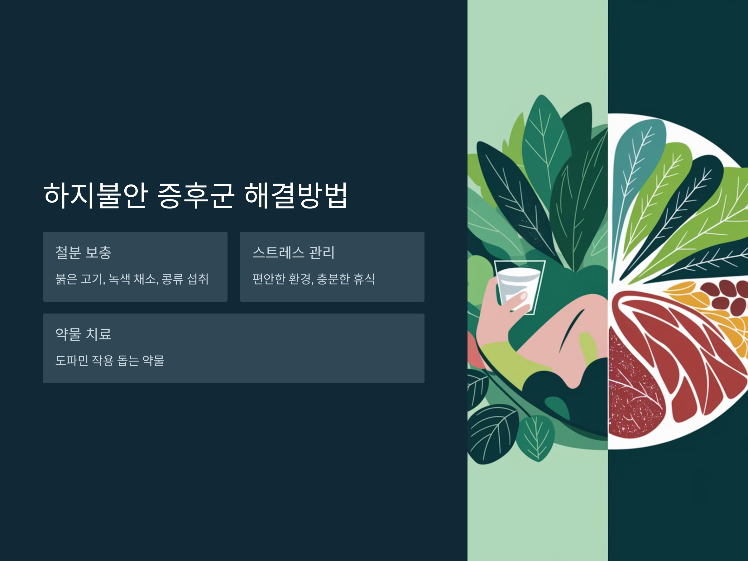 하지불안 증후군을 완화하기 위해서는 철분 보충이 중요한 부분이 될 수 있습니다. 철분이 결핍된 경우, 철분이 풍부한 음식인 붉은 고기, 녹색 채소, 콩류 등을 섭취하는 것이 좋습니다. 또한, 스트레스나 불안감이 증상을 악화시킬 수 있기 때문에 편안한 환경에서 충분히 휴식을 취하는 것이 중요합니다. 약물 치료도 가능하며, 특히 도파민의 작용을 돕는 약물이 도움이 될 수 있습니다.