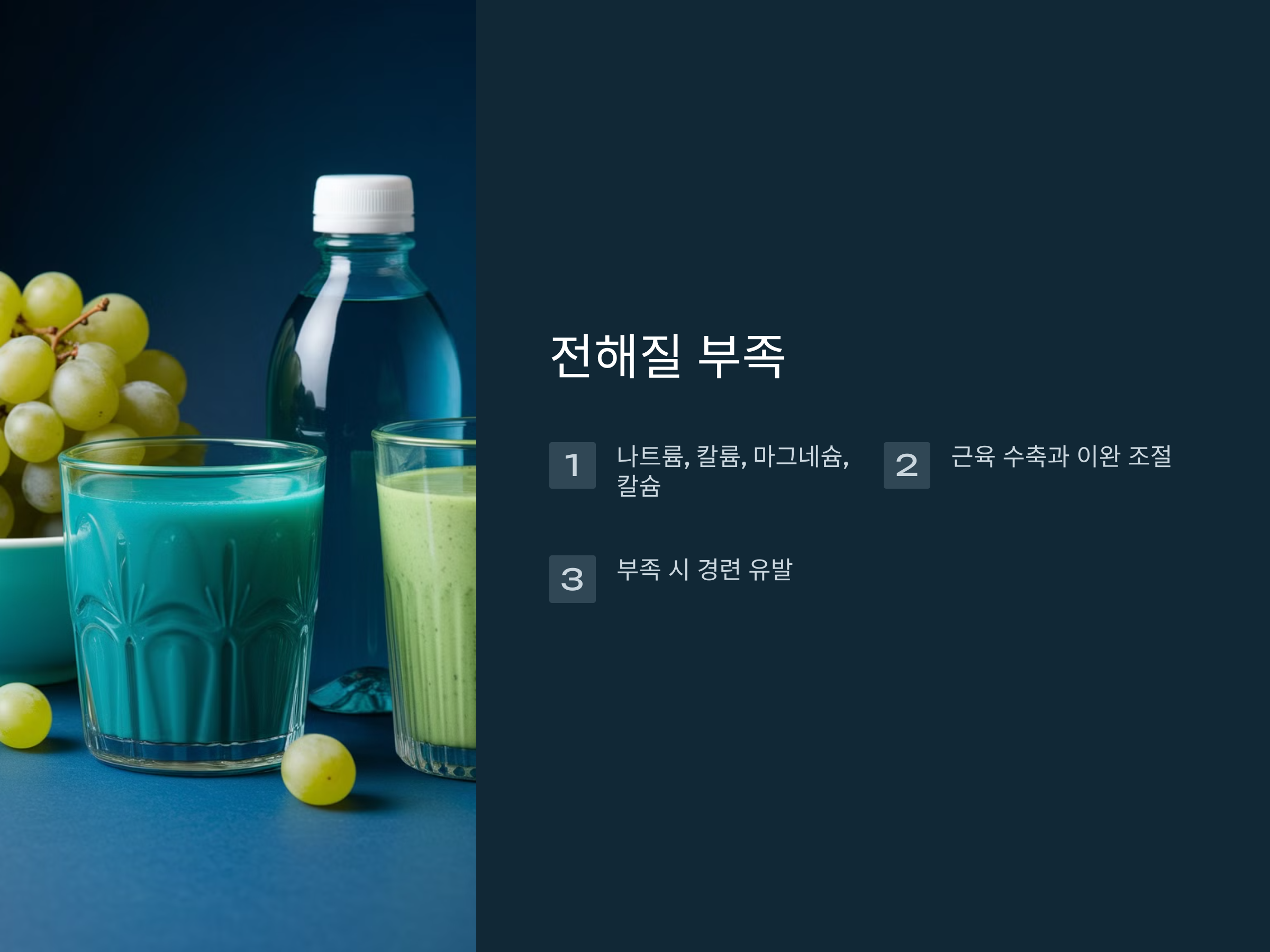 전해질이 부족하면 근육이 정상적으로 이완되지 않고, 경련을 일으킬 수 있습니다. 특히 밤에 자다가 다리에 쥐가 나는 경우, 체내 칼륨이나 마그네슘의 농도가 낮아지면 근육의 긴장도가 증가하여 경련이 발생할 확률이 높아집니다.