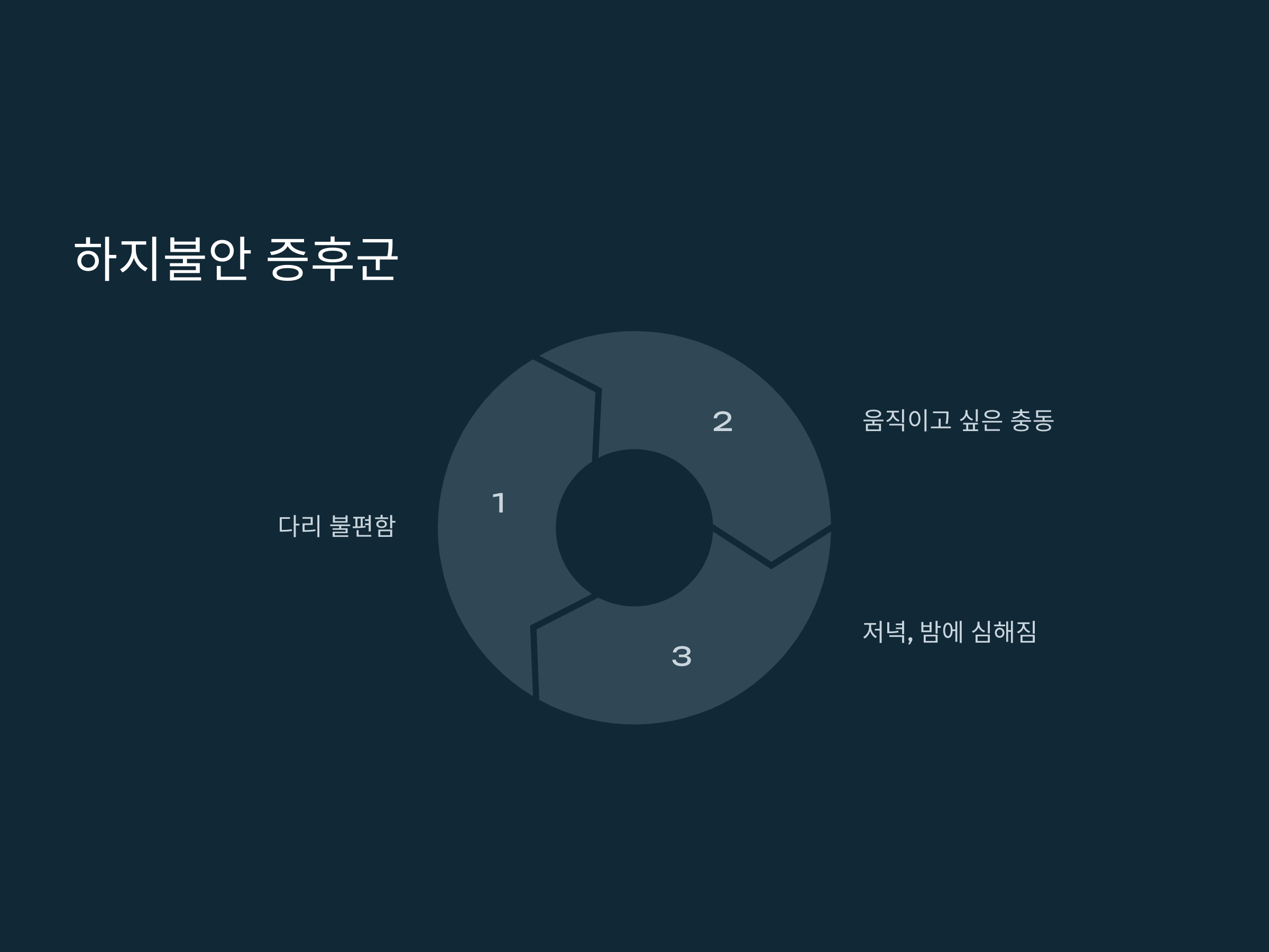 하지불안 증후군(RLS, Restless Legs Syndrome)은 다리의 불편함과 관련된 또 다른 주요 원인입니다. 이 증후군은 다리에 가만히 있으면 불편하고, 이를 해소하려는 본능적인 욕구로 다리를 움직이게 만듭니다. 주로 저녁이나 밤에 증상이 심해지며, 특히 잠자리에 들기 직전에 나타나는 경향이 있습니다.