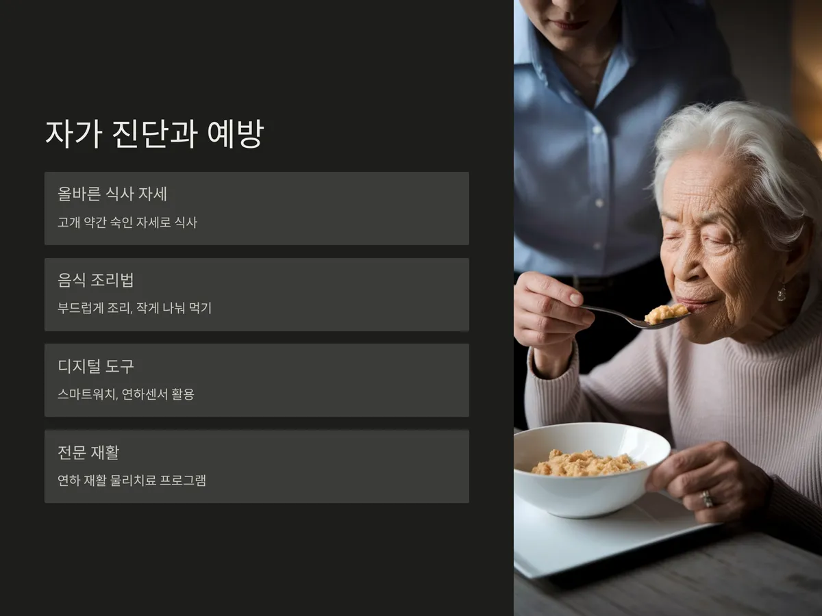 증상이 경미하다면 자가 진단과 예방 관리가 가능합니다. 특히 고령자나 기저질환이 있는 사람은 평소 식사 자세를 바르게 하고, 음식은 부드럽게 조리해 작게 나눠 먹는 습관이 중요합니다. 고개를 약간 숙인 자세로 식사하면 기도로 음식이 잘못 들어갈 위험을 줄일 수 있습니다.