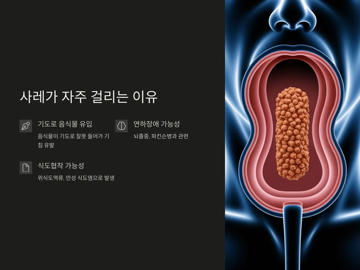 식사를 하다 보면 자꾸 사레가 걸리는 현상, 단순한 실수로 넘기기엔 반복될수록 신체에 큰 신호일 수 있습니다. 특히 고령자나 특정 질환을 앓고 있는 사람에게는 이 증상이 단순한 기침의 문제가 아니라 연하 장애나 식도 협착과 같은 중요한 건강 문제의 초기 신호일 수 있습니다. 최근 의학계에서는 이러한 증상의 빈도 증가와 관련하여 조기 진단과 치료의 중요성이 더욱 강조되고 있으며, 미국 소화기학회와 대한이비인후과학회에서도 연하장애 환자의 비율이 증가하고 있다는 보고를 발표했습니다. 게다가 스마트 헬스케어의 발달로 연하 기능을 측정하는 디지털 기기들이 상용화되면서, 집에서도 자가 진단과 초기 증상 체크가 가능해진 점은 매우 긍정적인 변화입니다.