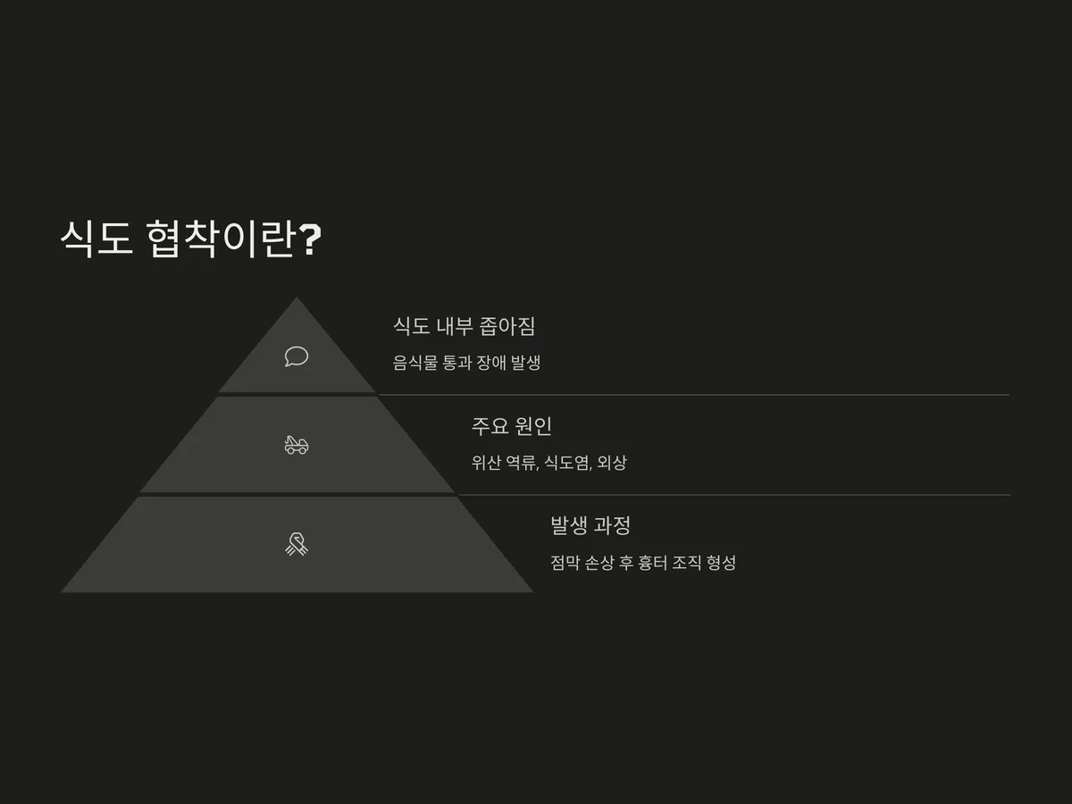 식도 협착은 식도 내부의 지름이 좁아져 음식물이 통과하는 데 장애가 생기는 상태입니다. 이로 인해 식사 중 갑작스럽게 체하거나 음식이 목에 걸리는 듯한 느낌을 자주 받게 됩니다. 협착의 원인은 다양하지만, 대표적으로는 만성적인 위산 역류(GERD), 식도염, 혹은 외상 등이 있습니다.