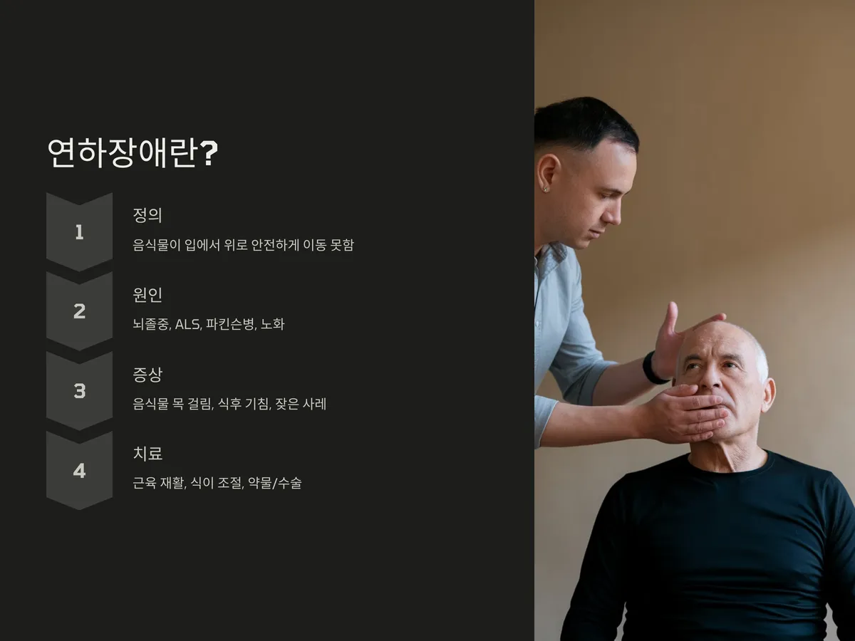 연하장애는 음식물이나 액체가 입에서 식도로, 그리고 위로 안전하게 이동되지 않는 상태를 의미합니다. 이 과정은 단순해 보이지만, 수많은 신경과 근육이 정밀하게 협력해야 하기 때문에 문제가 생기기 쉽습니다. 특히 뇌졸중, 근위축성 측삭경화증(ALS), 파킨슨병 등과 같이 신경을 침범하는 질환은 연하 능력을 현저히 떨어뜨릴 수 있습니다.