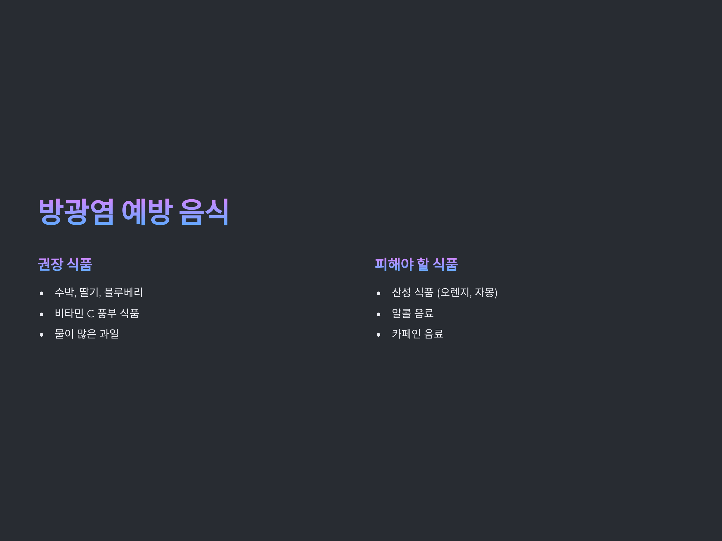 올바른 음식 선택도 방광염 예방에 중요한 역할을 합니다. 예를 들어, 산성 식품(예: 오렌지, 자몽)은 방광을 자극할 수 있기 때문에, 과다 섭취를 피하는 것이 좋습니다. 대신, 수박, 딸기, 블루베리 등 방광을 자극하지 않는 식품을 섭취하는 것이 좋습니다. 또한, 비타민 C는 방광염 예방에 효과적인 성분으로 알려져 있으므로, 이를 풍부하게 함유한 과일이나 채소를 자주 먹는 것이 좋습니다.
