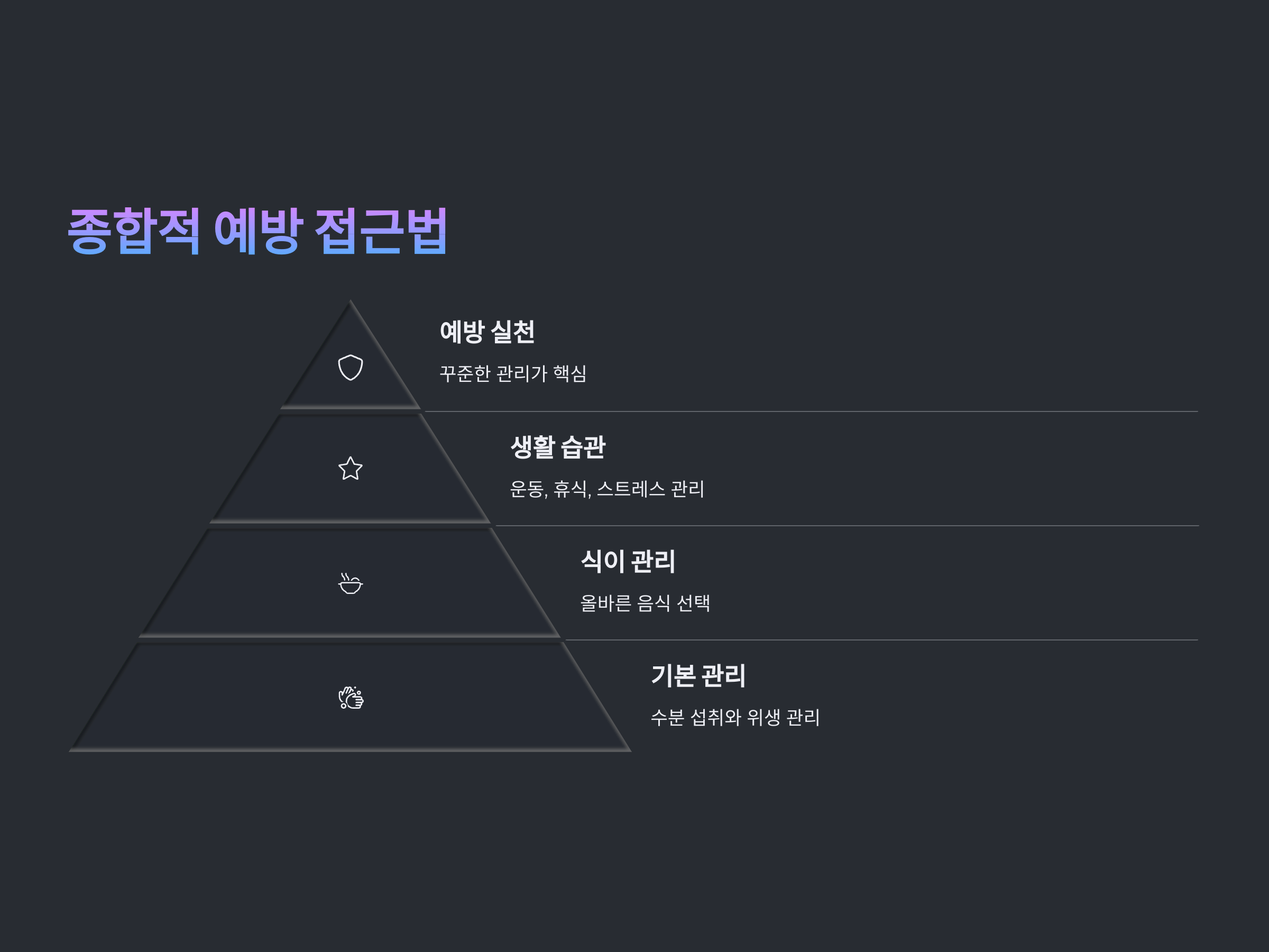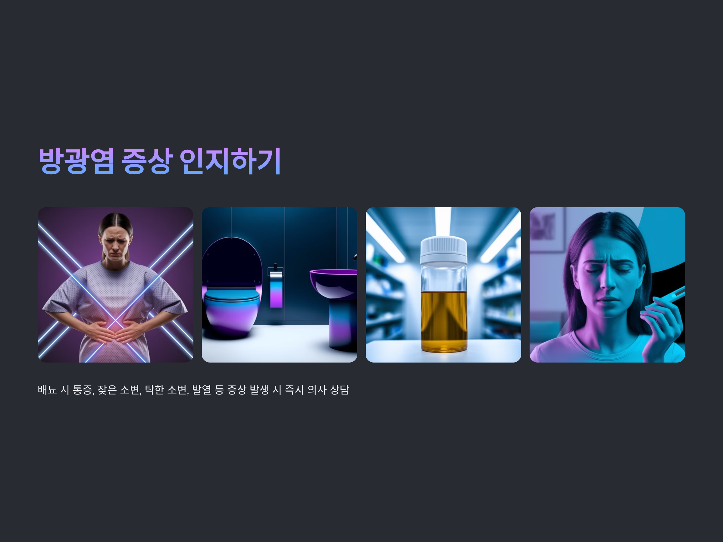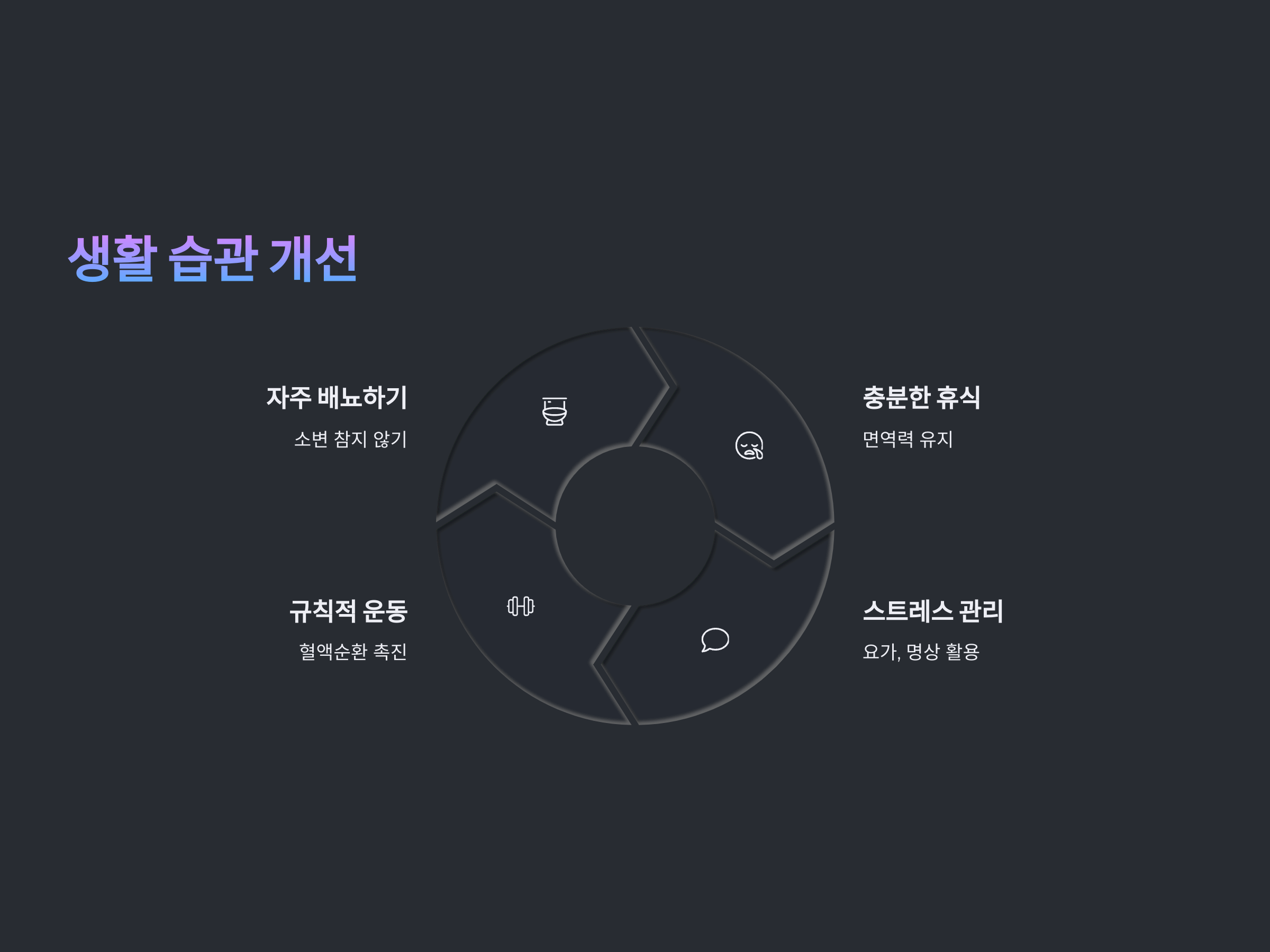 방광염 재발을 예방하려면 단순히 한 가지 방법에만 의존하는 것이 아니라, 다양한 예방책을 종합적으로 실천하는 것이 중요합니다. 충분한 수분 섭취, 철저한 위생 관리, 생활 습관 개선, 올바른 음식 선택 등 여러 가지 요소를 동시에 신경 써야 합니다. 이를 통해 방광염의 재발을 예방하고, 건강한 방광을 유지할 수 있습니다.