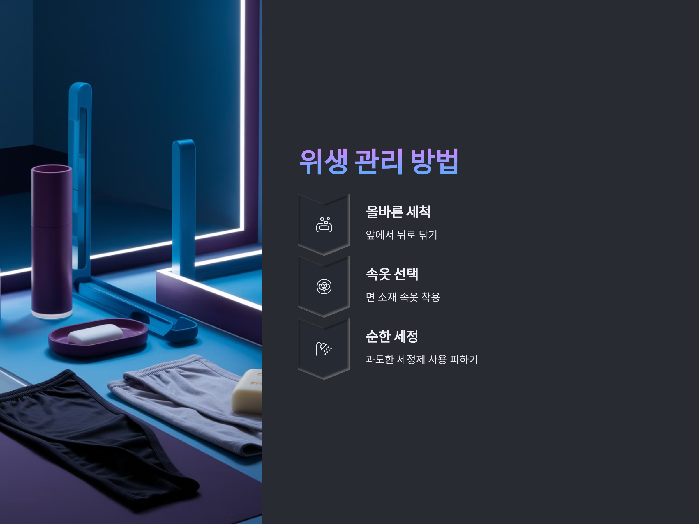배뇨 후에는 앞에서 뒤로 닦는 것이 중요합니다. 이는 세균이 항문 부위에서 요도 쪽으로 옮겨가는 것을 방지하기 위한 방법입니다. 또한, 과도한 세정제 사용은 질 내 균형을 깨뜨릴 수 있으므로, 가급적 순한 비누나 물로 세척하는 것이 좋습니다. 방광염 예방을 위해서는 위생적인 속옷 착용도 중요합니다. 면 소재의 속옷은 통기성이 좋아 땀을 흡수하고, 세균의 번식을 억제하는 데 도움이 됩니다.