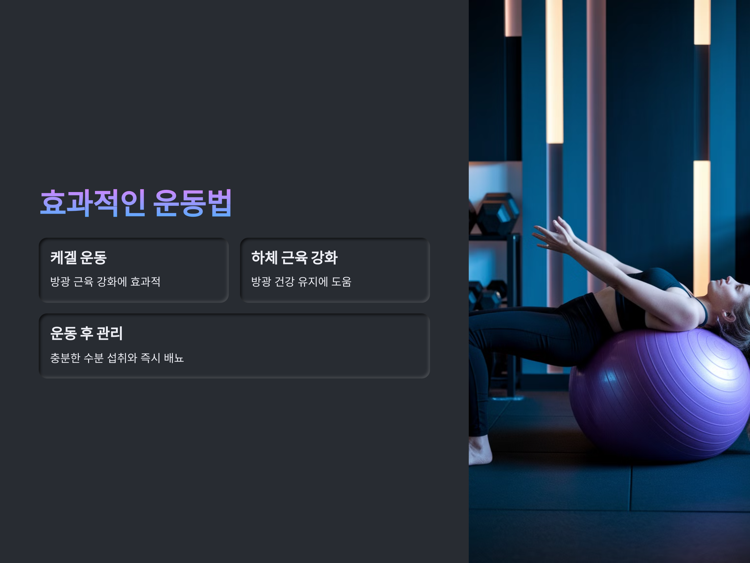 운동은 면역력을 향상시키고, 혈액 순환을 촉진하여 방광염 예방에 도움이 됩니다. 규칙적인 운동은 스트레스를 해소하고, 배뇨를 돕는 데 중요한 역할을 합니다. 특히, 하체 근육을 강화하는 운동(예: 케겔 운동)은 방광의 건강을 유지하는 데 큰 도움이 됩니다. 케겔 운동은 배뇨 후 요도와 방광 근육을 강화하여 방광염 예방에 효과적입니다.